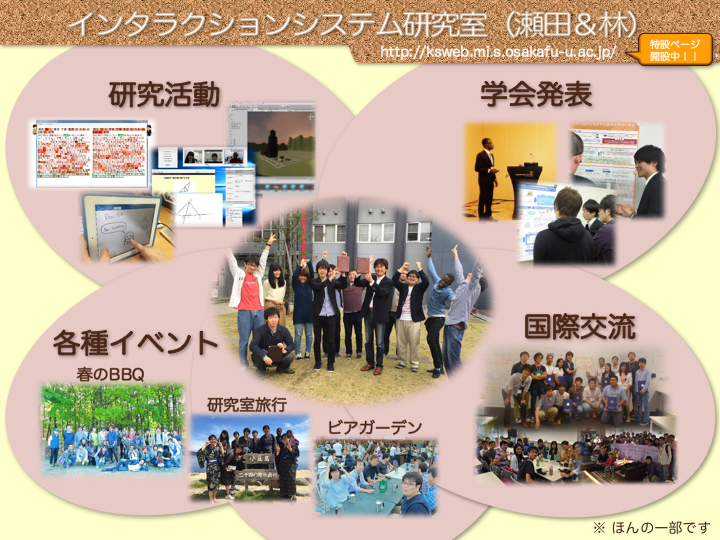 - 研究室見学:研究室見学は,夏休みも含め,随時応対しますので,メールで連絡してください.