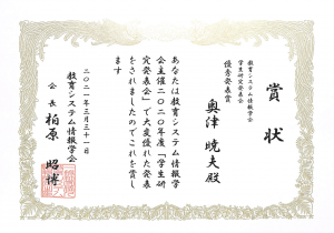 2021年 3月8日に開催されたJSiSE学生研究発表会(関東支部)にて発表した以下の論文について,奥津君が優秀発表賞を受賞しました!