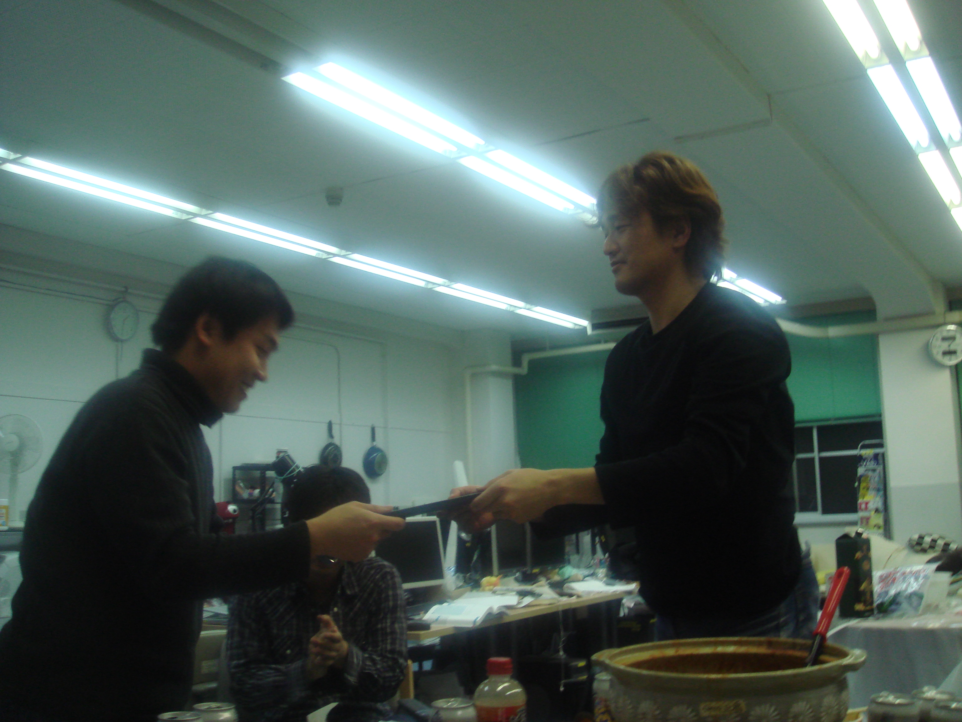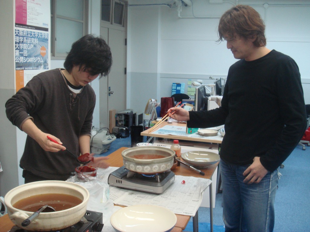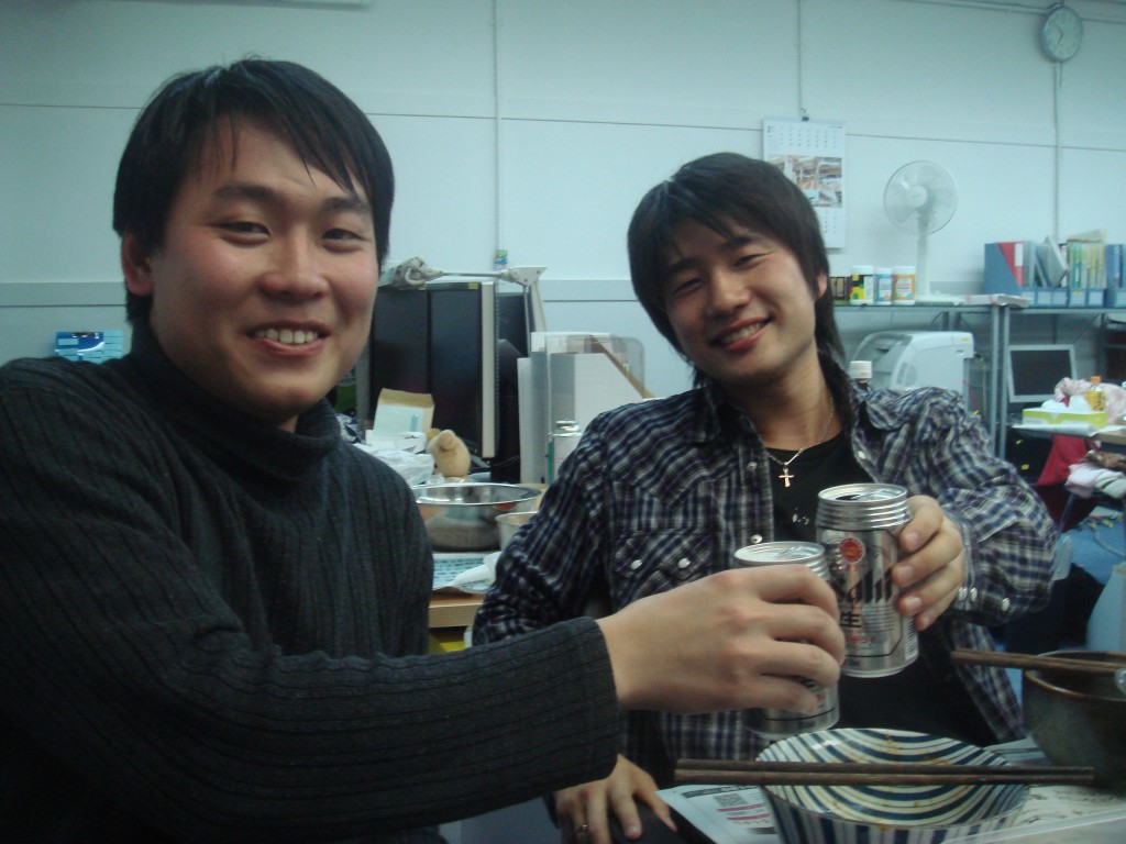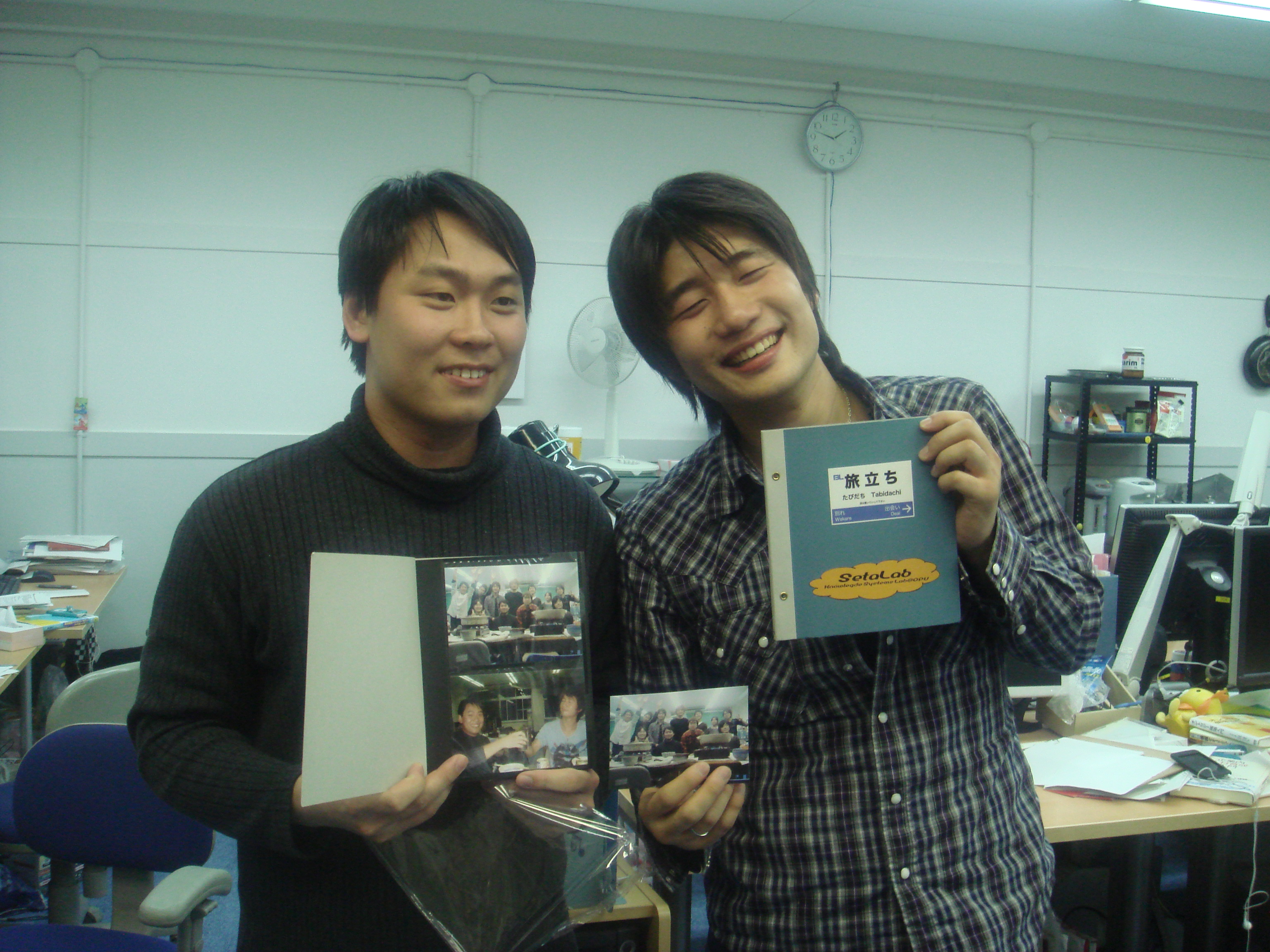本日は追いコンです。 のぐぅ~さんと先生が腕によりをかけて作ってます! 何やら鍋のようですが・・・ そうして出来た合作がこれ! てっちゃん鍋です。 うまそ~!! 皆で記念に一枚☆ミ M2のツーショットです。 かんぱ-い☆ いつもの二人です。 瀬田研での最後の勝負は引き分けです(笑) のぐぅ~さんから卒業生に贈る言葉です。 言いたい事がたくさんあって全員話し終えるのに かなり時間がかかりました! 師範代認定書の授与です☆ 佐竹さん、お世話になりました! 続いてQuangさんです。 これからもグローバルにがんばってください☆ 3回生から卒業生にプレゼントです☆ その中身はいったい・・・ プレゼントは瀬田研写真集です☆ 中には、二人のたどった3年分の写真!! 実は、最初に撮った皆での一枚もすぐに現像して プレゼントして早速入れてもらいました☆ もらった写真集にご満悦な佐竹さんです☆ 僕らのこと忘れないでください!(笑) 卒業生からのありがたいお言葉です☆ 今までお疲れさまでした!! 追い出しコンパ