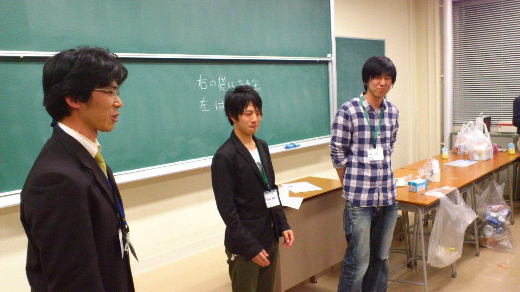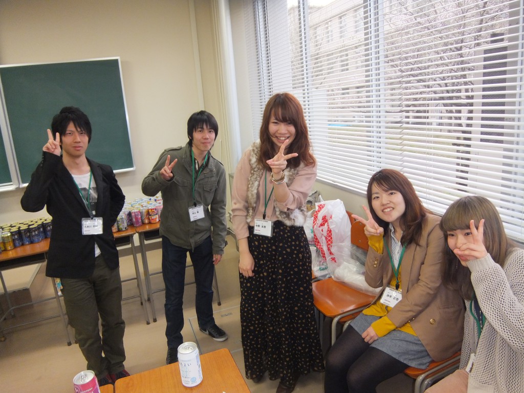 今日は新入生歓迎の為の親睦会です♪ 三回生の子たちが企画してくれました! 三回生が乾杯の音頭を取ってくれている途中の一枚です。 二回生と仲良く肩を組む島添さん。 二人とも良い笑顔です♪ みんな学年関係なくいろんな人と思い思いに話しています。 こういう学部生と院生と先生が一同に会する機会は色んな話を聞くチャンスです。 いい話は聞けたかな? ジョンさん嬉しそう(笑) 最後はこの二人が締めてくれました。 三回生のみなさん、おつかれさまでした。 ホントにありがとう!! 親睦会