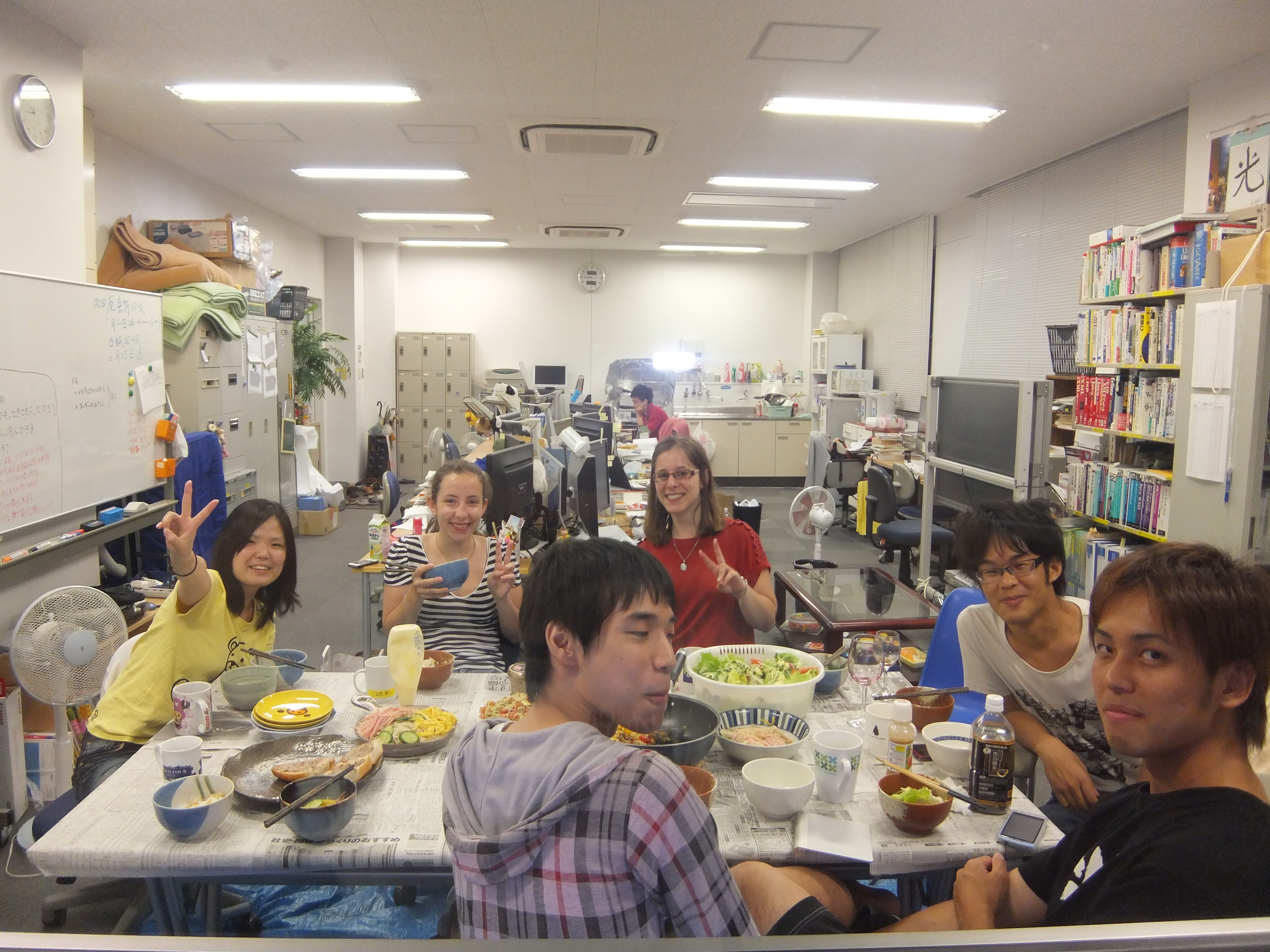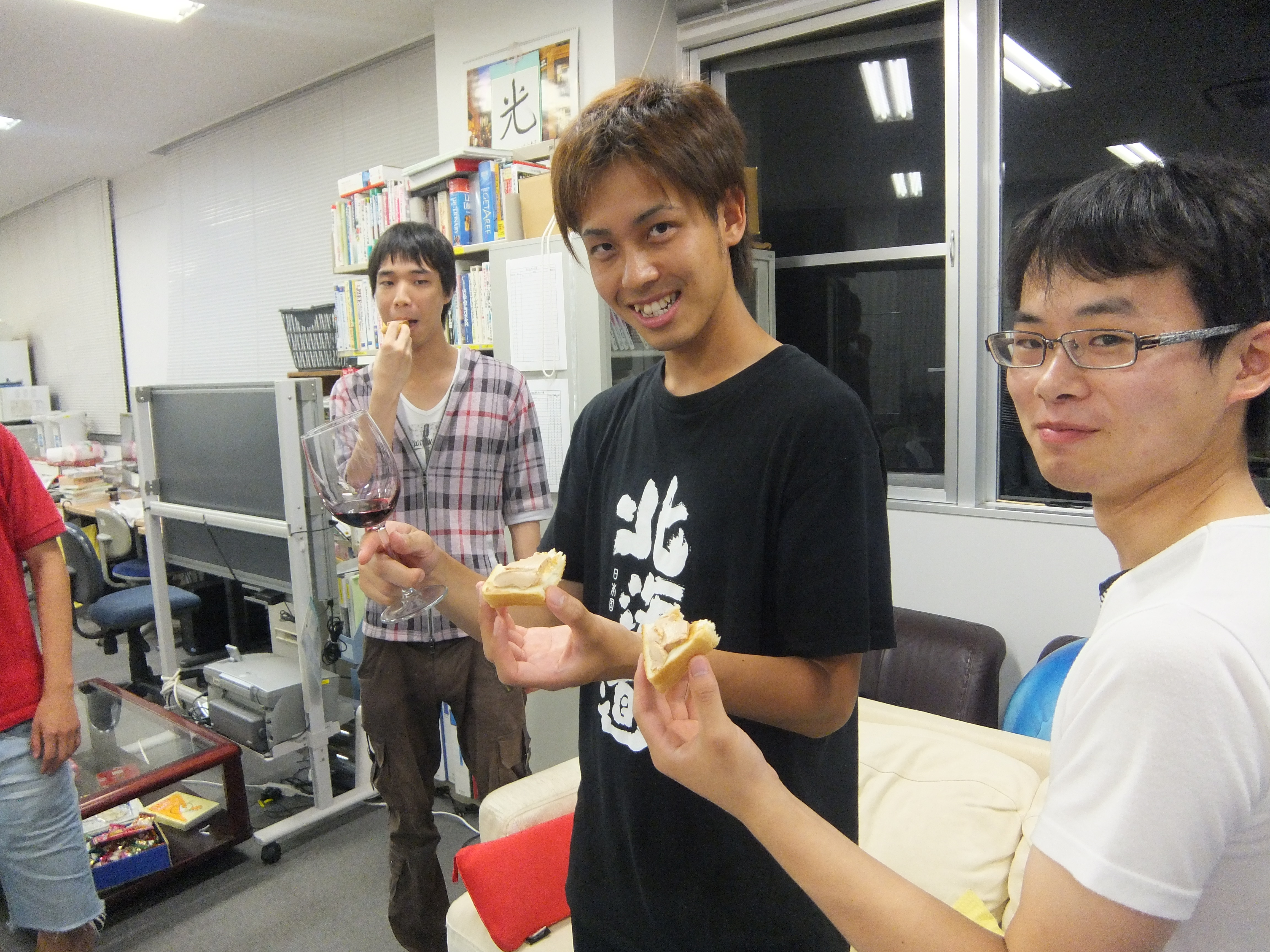 今日はエミリーの誕生日会!みんなでいっぱい料理を準備しました! エミリーが持ってきてくれたフォアグラを片手に一枚。みんな初フォアグラでした。 こちらは蔵田さんと本日の主役であるエミリー。めっちゃ華やかです! エミリーの友人のデルフィンも到着してみんなで一枚。さぁ、楽しみましょう! 最後は岡田研の杉森さんお手製のケーキを堪能。本当にエミリー、誕生日おめでとう!! EmilieのBirthday Party