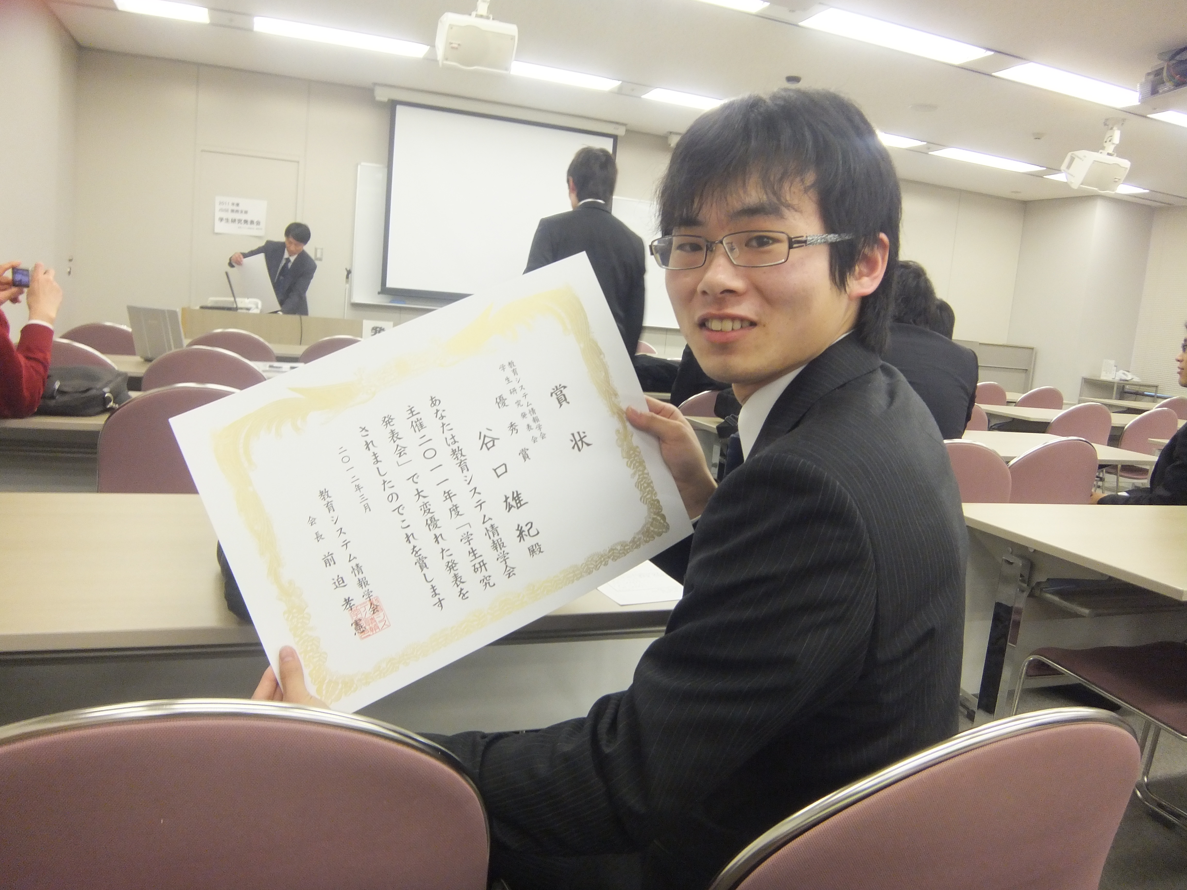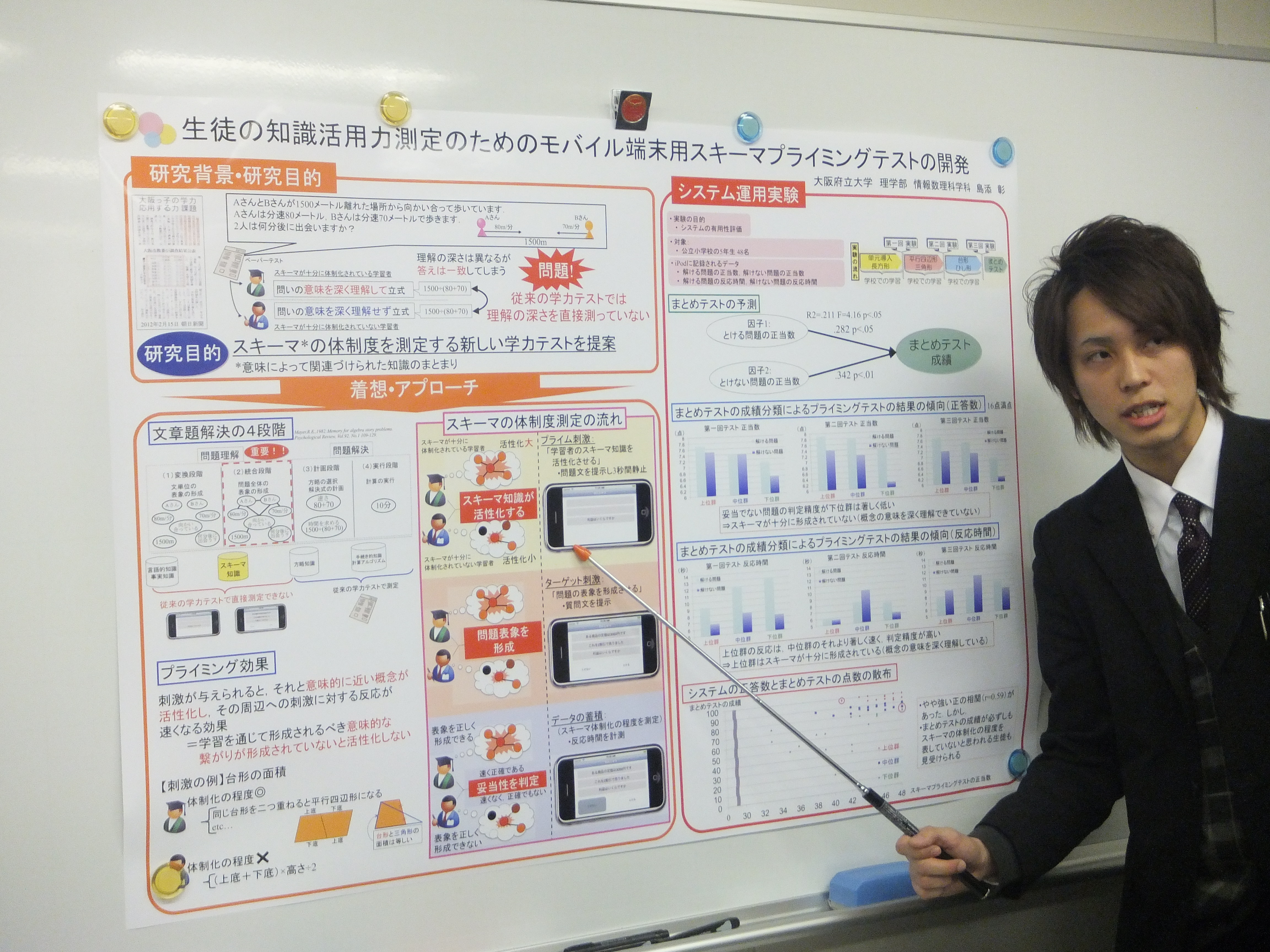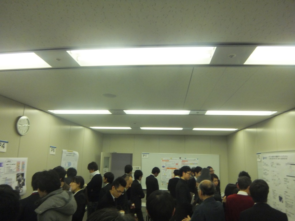 今日は JSiSE での発表です ! プレゼンもポスターもギリギリまで確認して準備しています . 先生と先輩方も応援に来てくれました! ありがとうございます. 最初は島添くんのポスター発表の場面です. しっかりと順序よく研究内容を発表していました. 後半になると慣れてきたのか聞いてくれている人の様子も見ながら発表できていました. ポスター発表の会場には沢山の人が見に来ていました♪ 発表していた研究はみんなとても興味深いものでした. 続いてプレゼンの場面です. まずは,谷口くんの発表です. 少し緊張している見たいですが,聞いてくれている人を見ながら発表していました. 次は徳本さんの発表です. 徳本さんはこの会場での最後の発表でした. スライドを指しながら研究内容を発表していますね. 発表が終わって疲労困憊の二人・・・ 笑顔だけど疲れが見えますね ;; アレ? 誰かの手が伸びてますね ( 笑 ) 閉会式ではプレゼンとポスターの優秀者の表彰がありました. 谷口くんがプレゼンの優秀賞をもらいました! 良い笑顔です☆ 帰りに会場のロビーで今回発表した 4 回生で記念写真♪ みんな無事に終わって安心した笑顔ですね☆ 終わってからの打ち上げです! みんなで楽しみました! 佐竹さんからビールの贈り物をいただきました. ありがとうございます! 美味しくいただきま~す☆ JSiSE&ビール