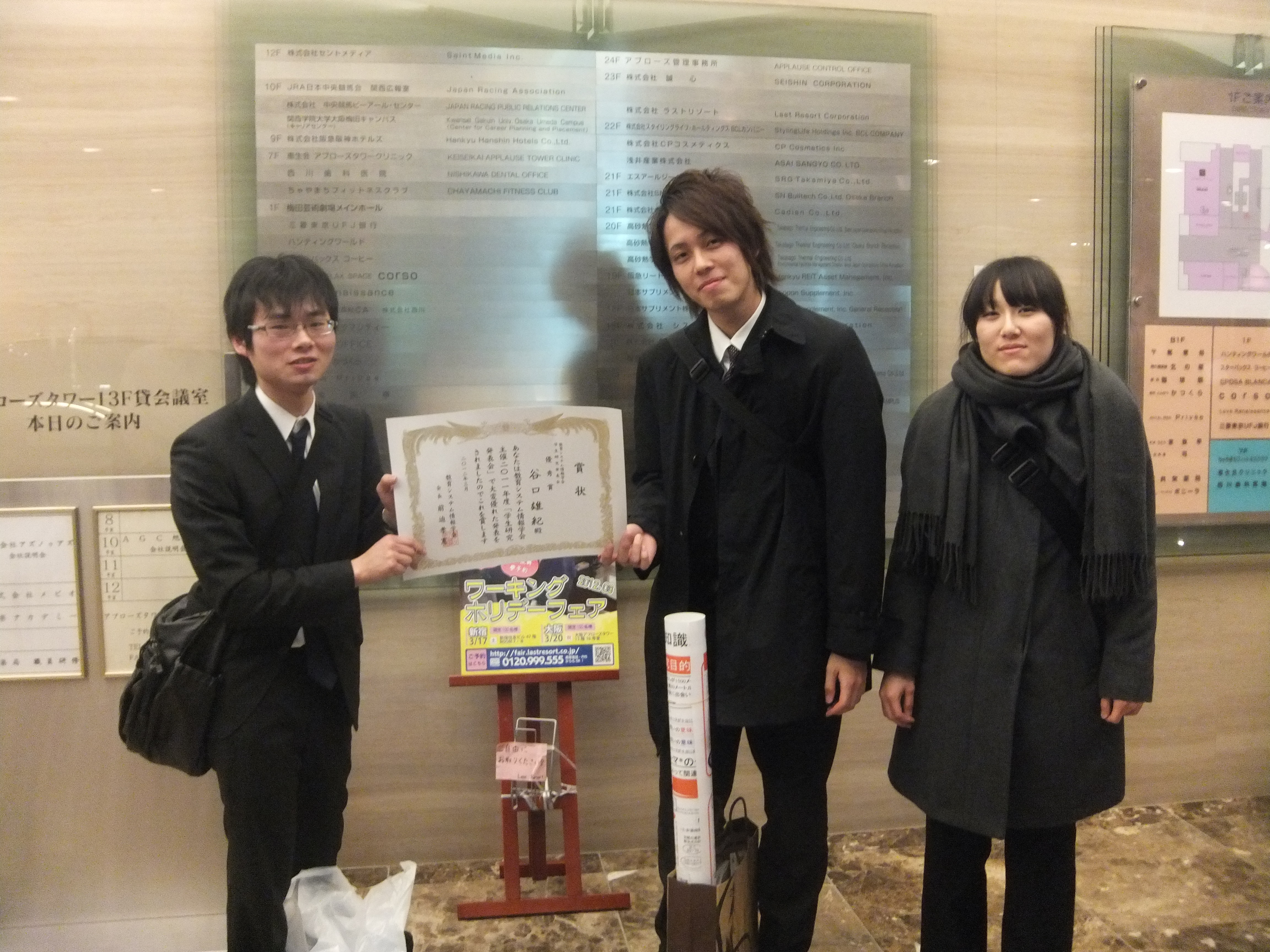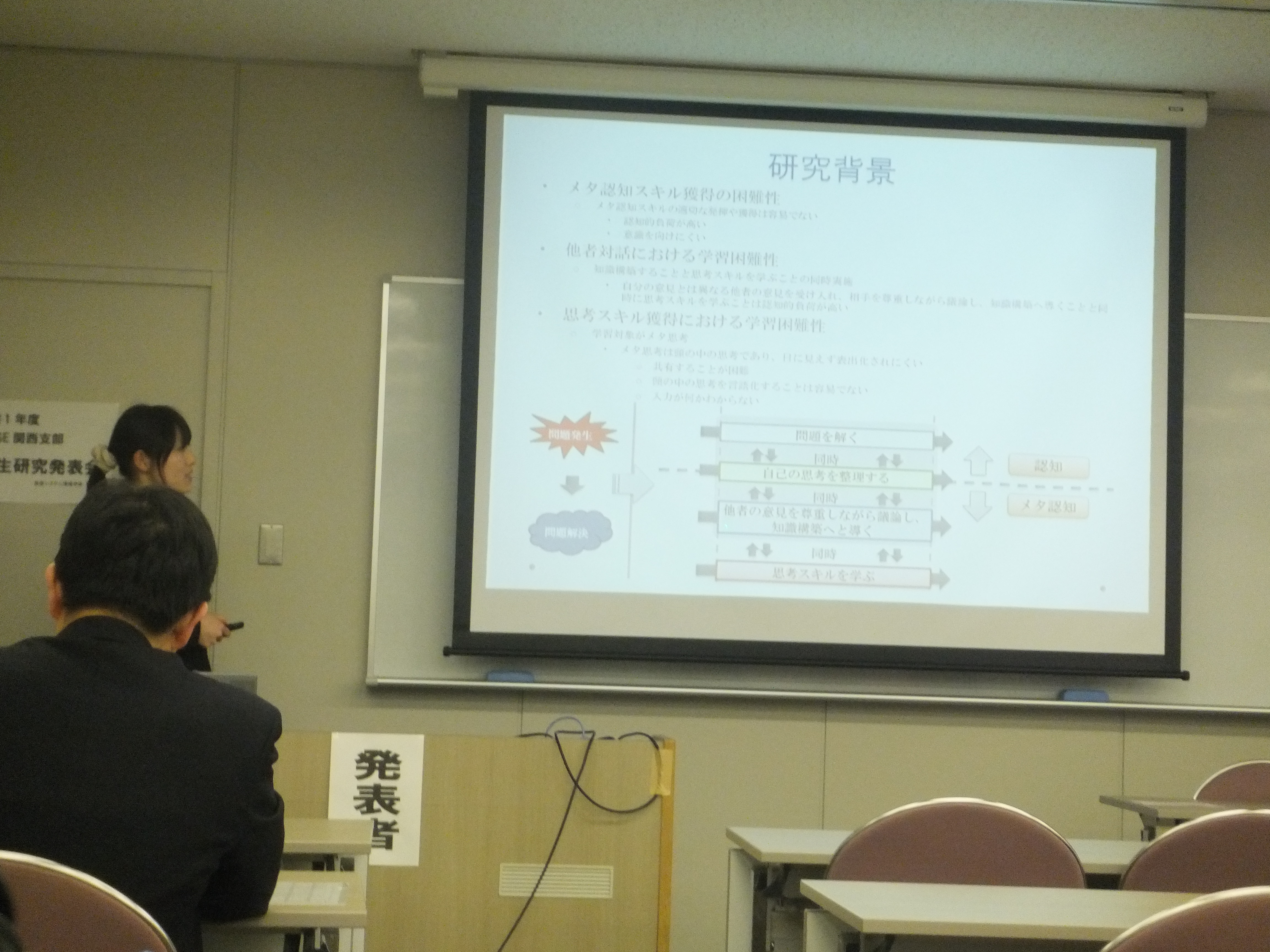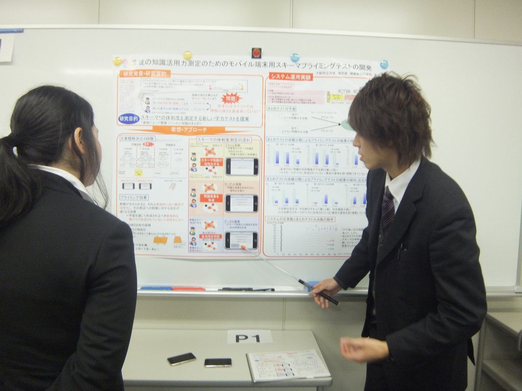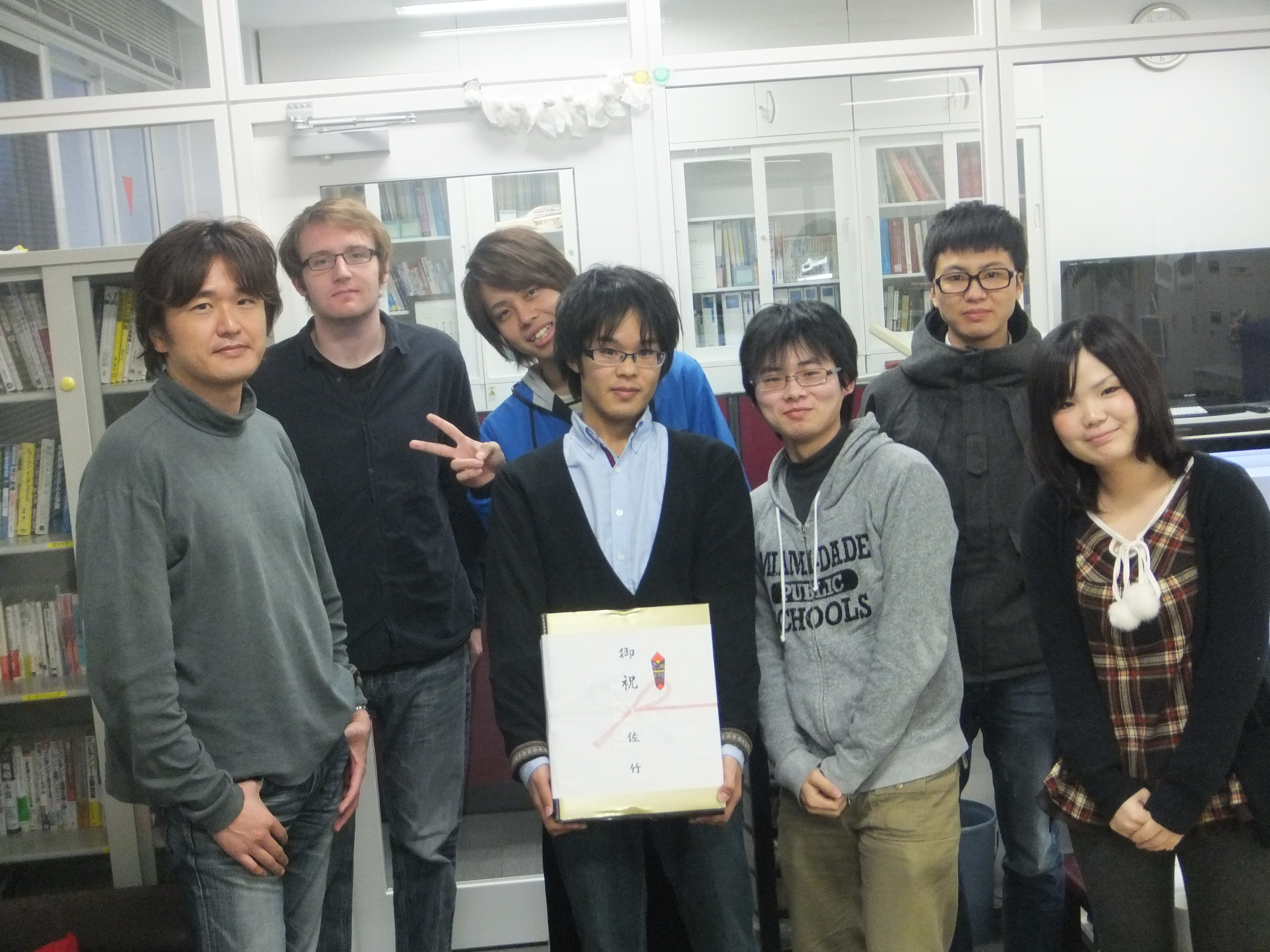 今日は JSiSE での発表です ! プレゼンもポスターもギリギリまで確認して準備しています . 先生と先輩方も応援に来てくれました! ありがとうございます. 最初は島添くんのポスター発表の場面です. しっかりと順序よく研究内容を発表していました. 後半になると慣れてきたのか聞いてくれている人の様子も見ながら発表できていました. ポスター発表の会場には沢山の人が見に来ていました♪ 発表していた研究はみんなとても興味深いものでした. 続いてプレゼンの場面です. まずは,谷口くんの発表です. 少し緊張している見たいですが,聞いてくれている人を見ながら発表していました. 次は徳本さんの発表です. 徳本さんはこの会場での最後の発表でした. スライドを指しながら研究内容を発表していますね. 発表が終わって疲労困憊の二人・・・ 笑顔だけど疲れが見えますね ;; アレ? 誰かの手が伸びてますね ( 笑 ) 閉会式ではプレゼンとポスターの優秀者の表彰がありました. 谷口くんがプレゼンの優秀賞をもらいました! 良い笑顔です☆ 帰りに会場のロビーで今回発表した 4 回生で記念写真♪ みんな無事に終わって安心した笑顔ですね☆ 終わってからの打ち上げです! みんなで楽しみました! 佐竹さんからビールの贈り物をいただきました. ありがとうございます! 美味しくいただきま~す☆ JSiSE&ビール
