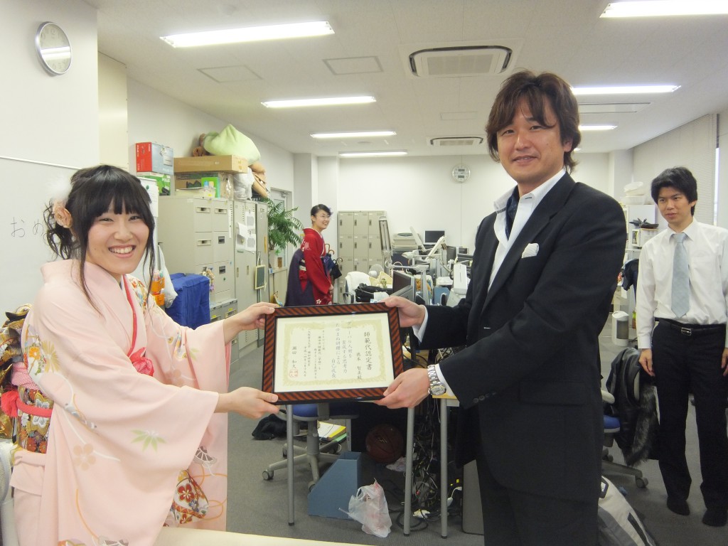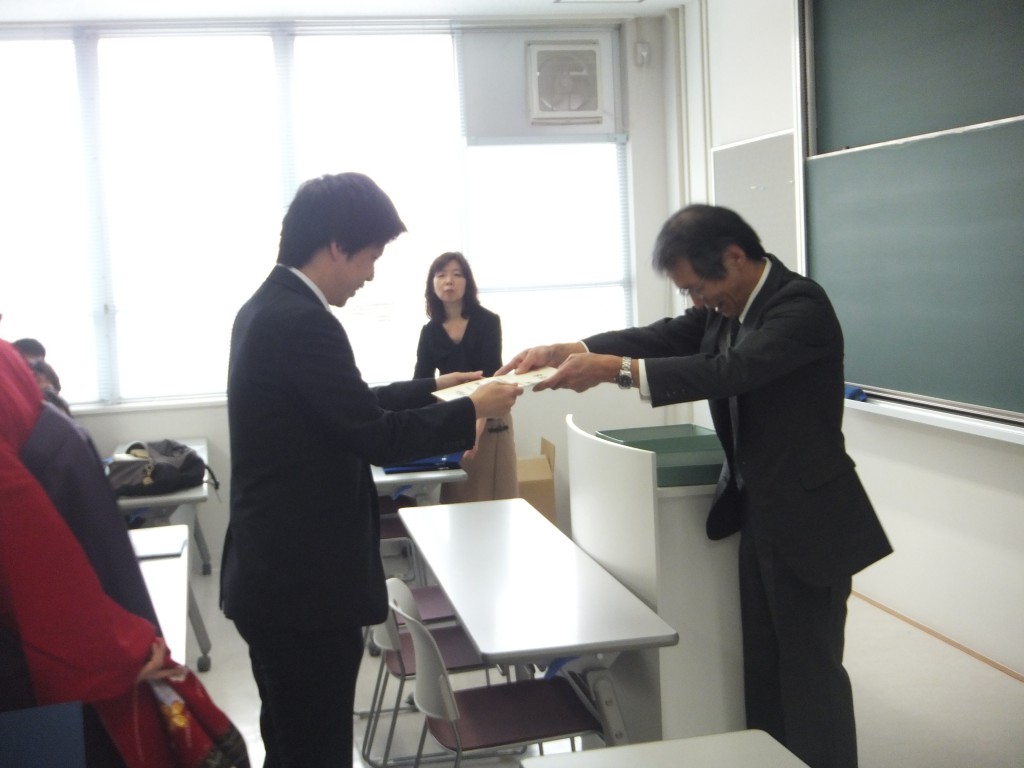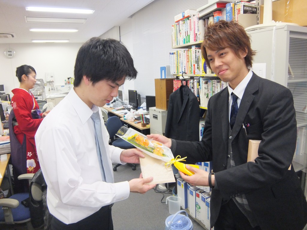 卒業式はあいにくの雨でしたが、卒業される先輩方をがんばって探しました! 廣田さん!めっちゃきれいです! 島添さん、いい笑顔すぎますw ひとりひとりに加茂先生から証書が渡されます。卒業おめでとうございます!!!! M2の皆さんで一枚。もう先輩方が来られないと思うとさみしく感じますね… B4の女性陣です。めちゃくちゃ美人のかたばっかりです! 今度はB4男性陣。あと二年お世話になります。よろしくお願いしますね! 追いコンを途中で用事があって帰ってしまっていた徳本さんに先生からの賞状の授与です! 業される先輩に花と手作りのアルバムのプレゼントです! 本当にお世話になりました。 今までありがとうございました!! 卒業式