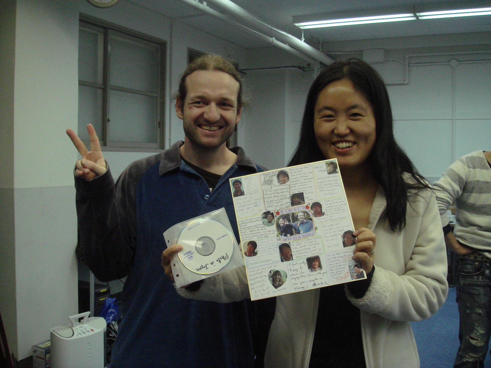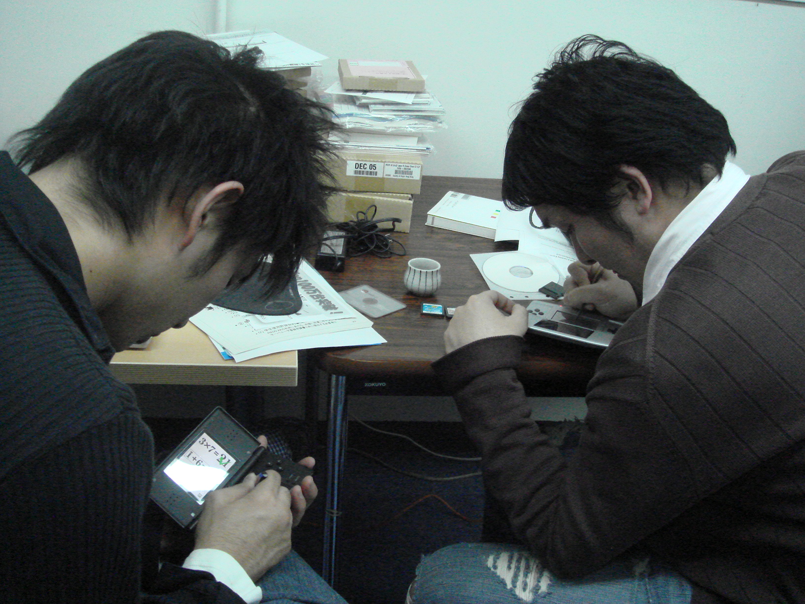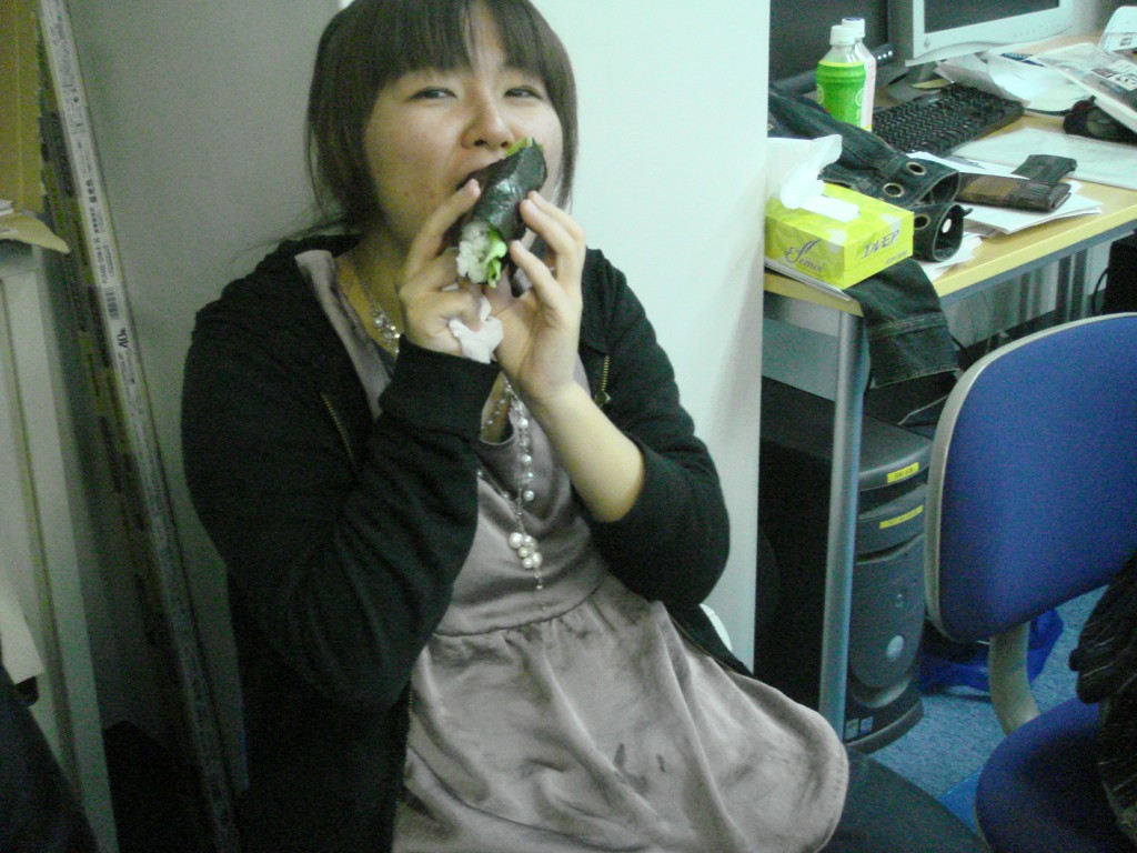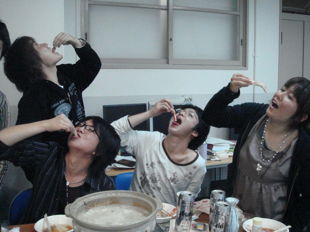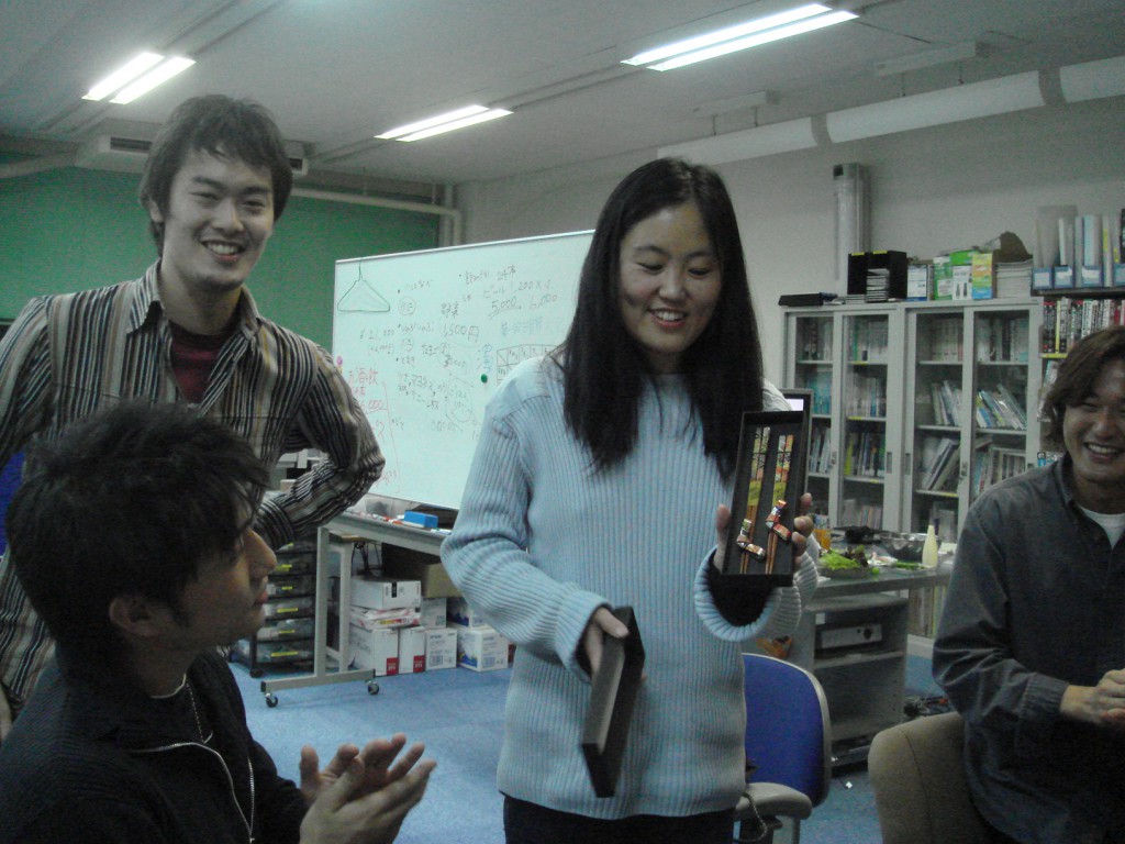 今日は立花さんにいただいたカニを食します!! ありがとうございます! 「あーん♪」 あっとゆう間になくなっちゃいました・・・。 しゃぶしゃぶして、半生の状態で食べるのが、まじうまかったっす!! Wendyと手巻き寿司にTRY☆ ちょっと、大きくつくりすぎちゃったみたい。笑 そして、西村さんの手料理。土手煮。 今回は・・・今回も?大好評でした☆☆ おちょこ持参?! カニ、手巻き、土手煮、熱燗・・・ 今日は、豪華です☆ Wendyに「おはし」をプレゼント♪ DSで暗算大会! さすが、数学専攻!すごい記録連発! みんなで色紙をおくりました。 この度は、いい経験がたくさんできました! 短い間でしたが、ありがとうございました♪♪ Farewell Party for Wendy with カニ