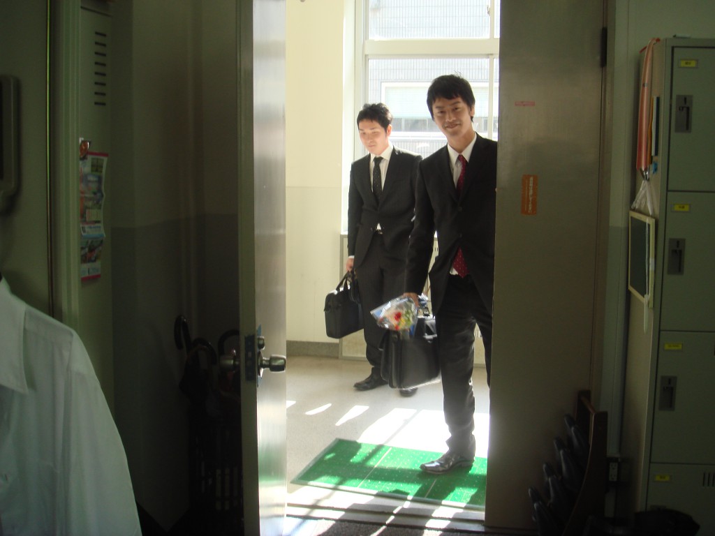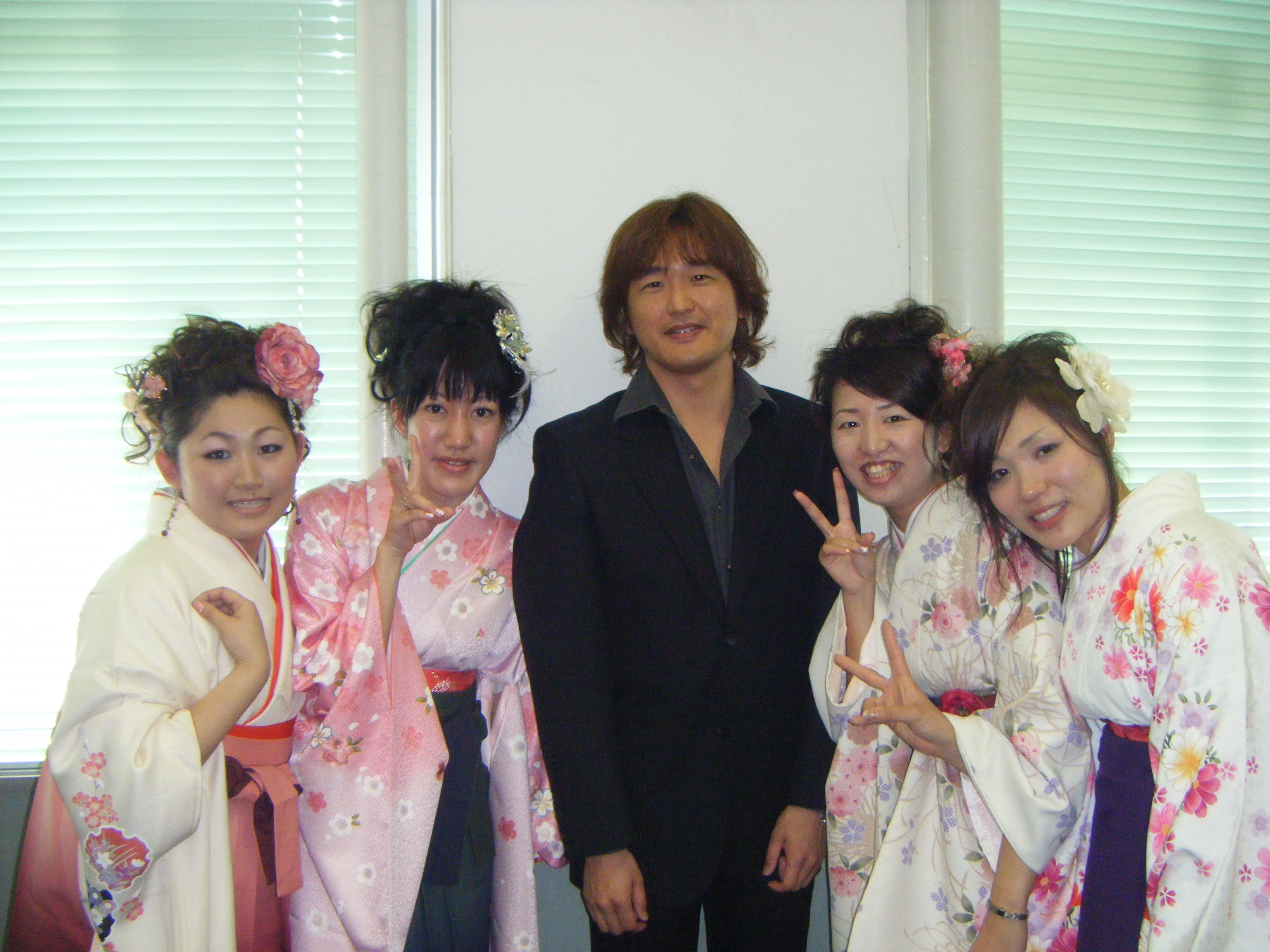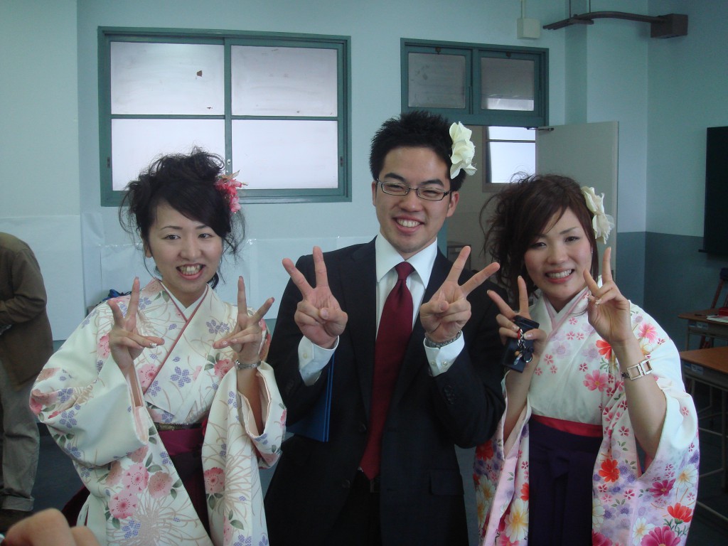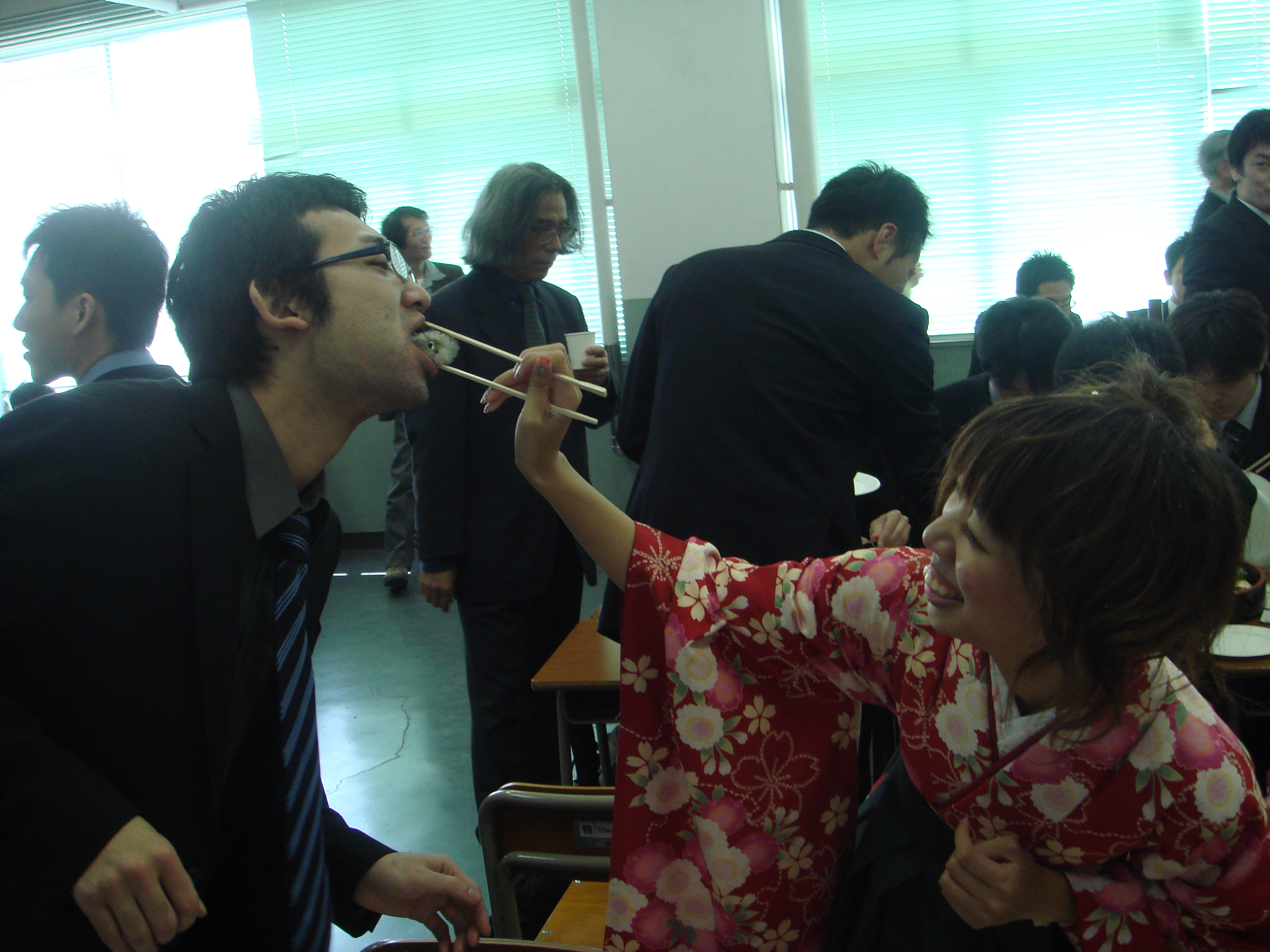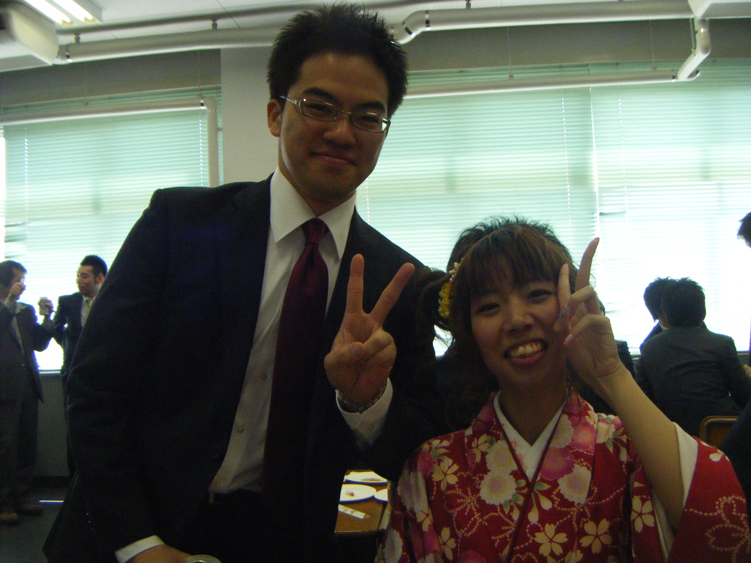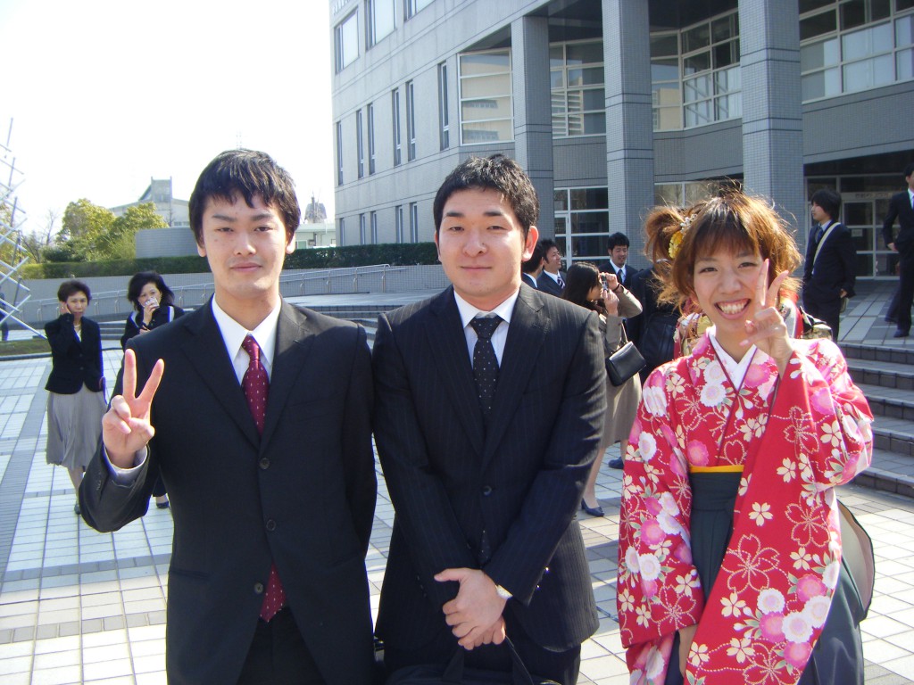 卒業式 本日は卒業式です。 ホールの前で開始前の一枚☆ 卒業生へのお花のプレゼントです。 卒業おめでとうございます☆ なんと卒業生のみなさんから 「エスプレッソ・カプチーノマシーン」を頂きました!! ありがとうございます!! ポットの横に置かせて頂きました!! これからコーヒーライフを楽しみたいと思います♪ 4回生のお2人。 配属されたころはほとんど会話がなかったそうですが(笑)、 今では仲良しさんです♪ M2のお2人。 6年間お疲れ様でした☆ 感概ひとしおですね!! あーん☆ ハーレム西村さん☆ 頭にお花つけて可愛らしいですね♪(笑) 今度はハーレム中原さんです☆ とても華やかですね♪ 最後は先生のハーレムです(笑) 男性陣みんな幸せそうですね☆ そしてお別れのときです… なんだかせつない一枚です… 本当にたくさんお世話になりました!! 本当にありがとうございました!! 卒業式