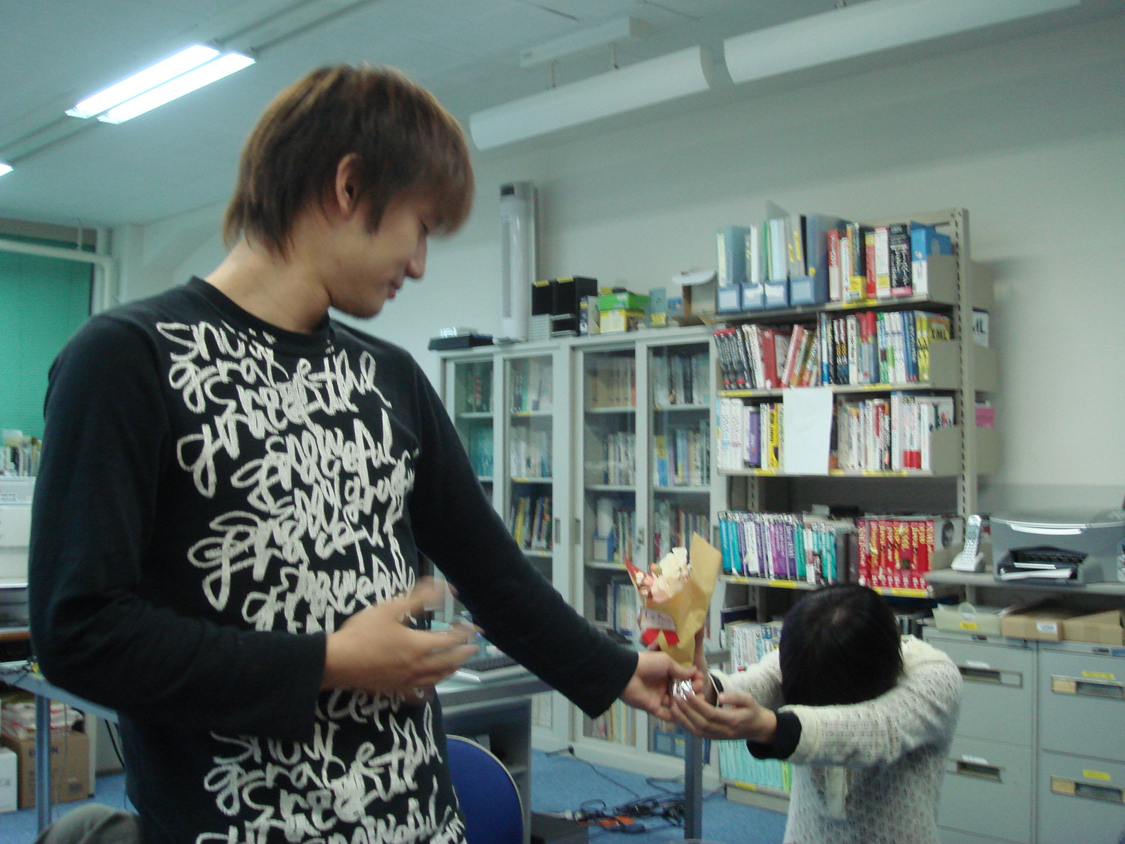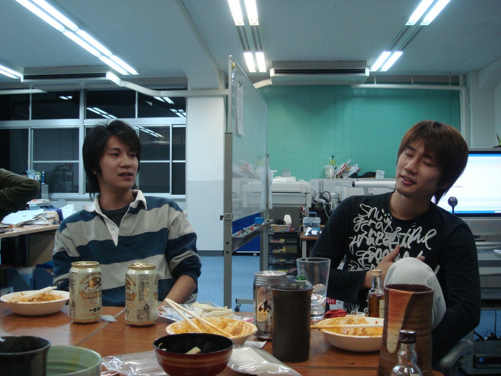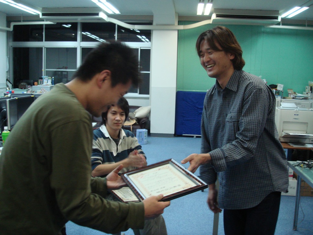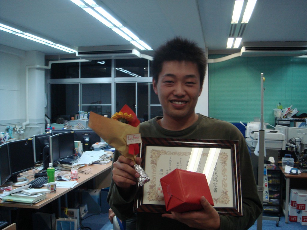 いつも研究室にいるときはメガネの岡澤さん。 今日はコンタクトを入れて気合ばっちりです! 一番声が大きかったです! 毎日遅くまでおつかれさまでした。 余裕のカメラ目線!! そして決め顔!!!! ご、ごめんなさい。ぶれちゃいました・・・。 廊下中に漂う匂いに誘われ、岡田先生も参加! はい、チーズ☆ 恒例のてっちゃん鍋開始で~す! パチパチチパチ(拍手)師範代認定書が進呈されました♪ 今日は絶対泣かへんと豪語したカジさん。 笑顔が素敵です☆ 愛媛に行ってもがんばってください!! 証書と花束とプレゼントを手に喜ぶ(?)岡澤さん。 ちなみに、プレゼントは時計でしたー! 先生が「俺もほしい!」と言ったほどの代物です☆ ・・・特に意味はございません。 岡澤さんの告白に胸キュンした佐竹さん。 本当に仲良しさんです♪。 お仕事中にもかかわらず登場してくださった立花さん。 ありがとうございました!! カジさん、今日は絶対泣きません!とまだ笑顔です。 あれ? 卒論発表会&追い出しコンパ☆