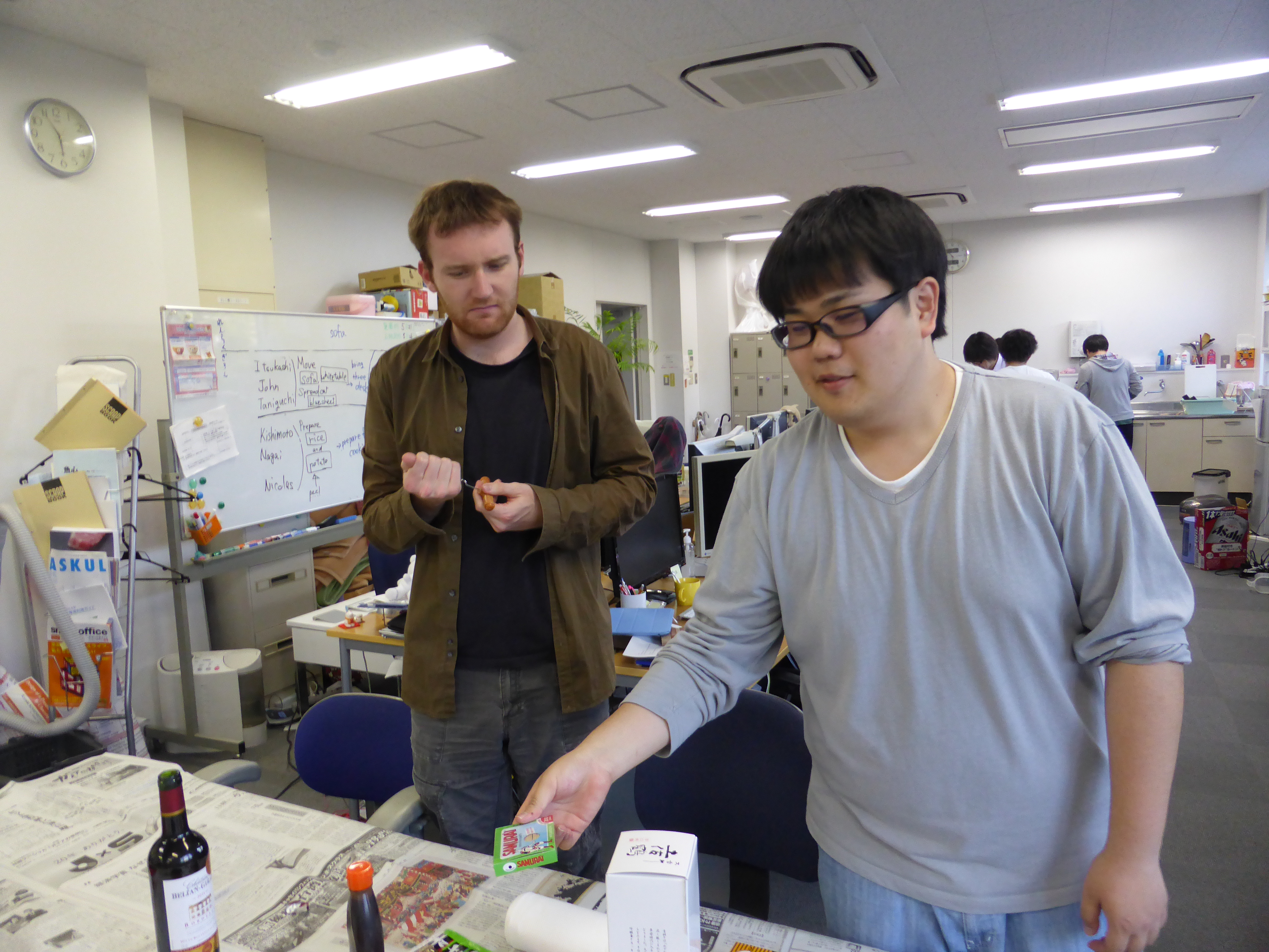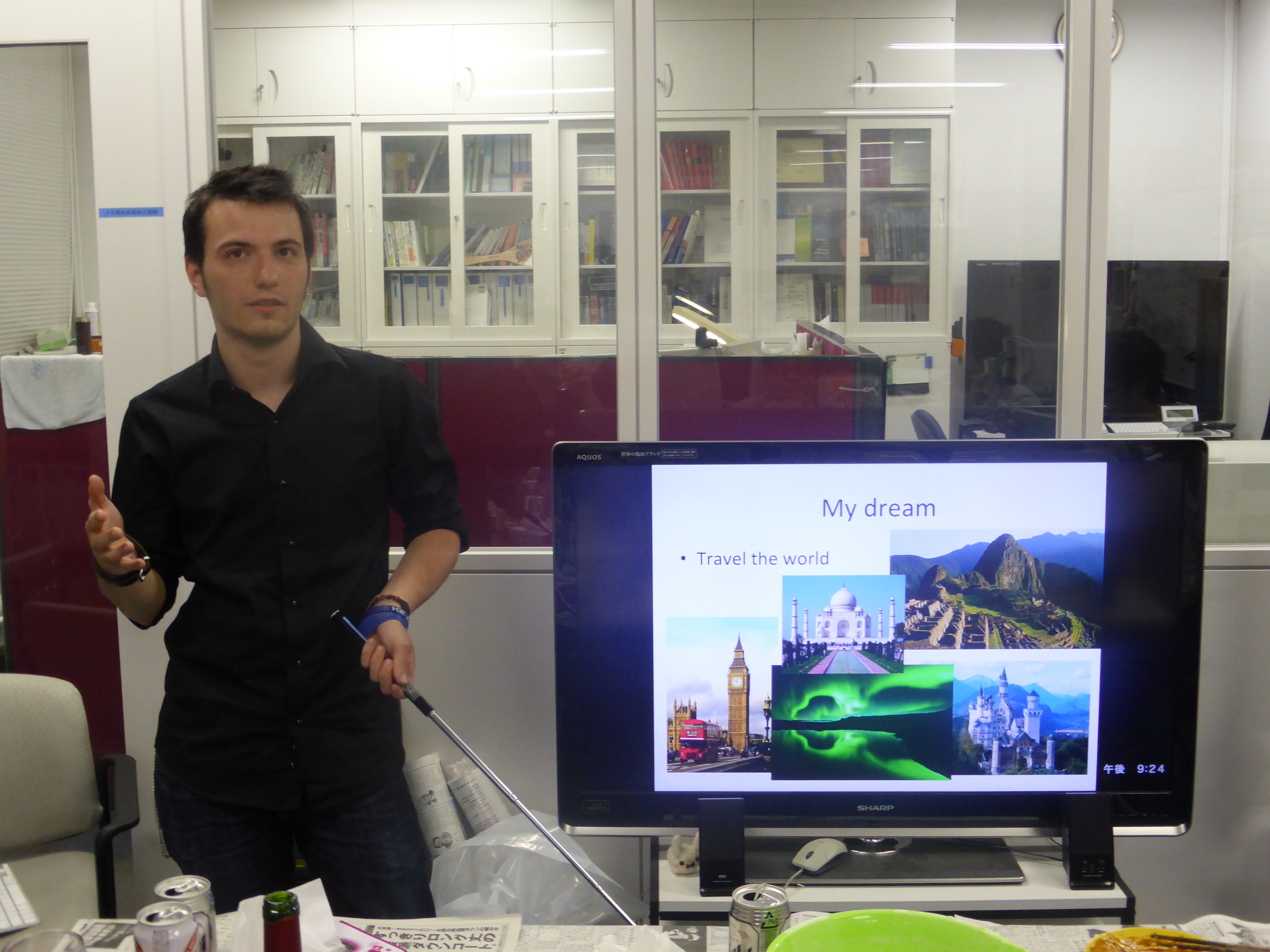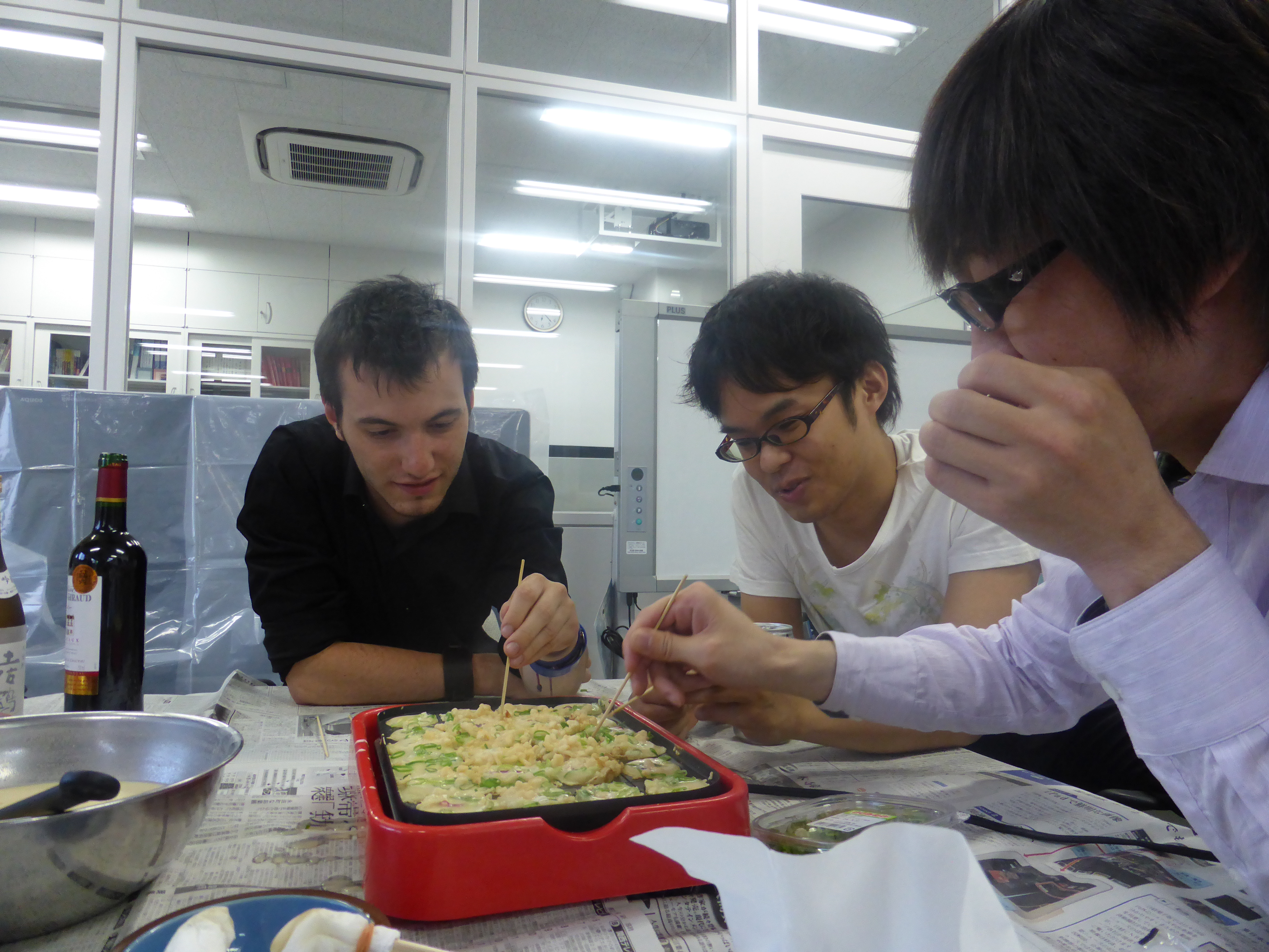 改めまして、新留学生ニコラが瀬田研究室にやって参りましたーv(^o^)v 笑顔が似合う男ですね! そんなニコラのために今日はWelcome Party! メニューは大阪名物たこ焼き。 林先生もタネを作っていらっしゃいます。 ちなみに今回はたこ以外にも、ウィンナー、チーズ、キムチ、じゃがいも、さらにワサビとかも入れちゃったりしてます。 谷口くん曰く、ワサビ入りも結構イケるらしい。 いつものアングルから 乾杯~(  ̄∀ ̄)/C□ ニコラたこ焼き作り初挑戦! うまく回せてるでしょうか? さらにさらに日本食体験コーナー! ニコラ初冷奴です。 箸も器用に使えてますねー。 先生今日もキマってます。 手に持っているのはジョンのフランスからのお土産のワインです。 4月からOBになられた島添さん・谷口さんが3月に行かれたET研究会のお土産のお酒もいただきました。 おいしかったです。ありがとうございました! そして始まる自己紹介タイム。 もちろん僕たちも英語です。 ニコラは日本の文化とかも知っていていろいろ話も合います。 そして世界旅行と、非常に大きな志を持っていますね! ニコラこれからもよろしく! それにしてもこのたこ焼きちゃんたち、こりゃ見てるだけでお腹が空きますわー(笑 Welcome party for Nicolas