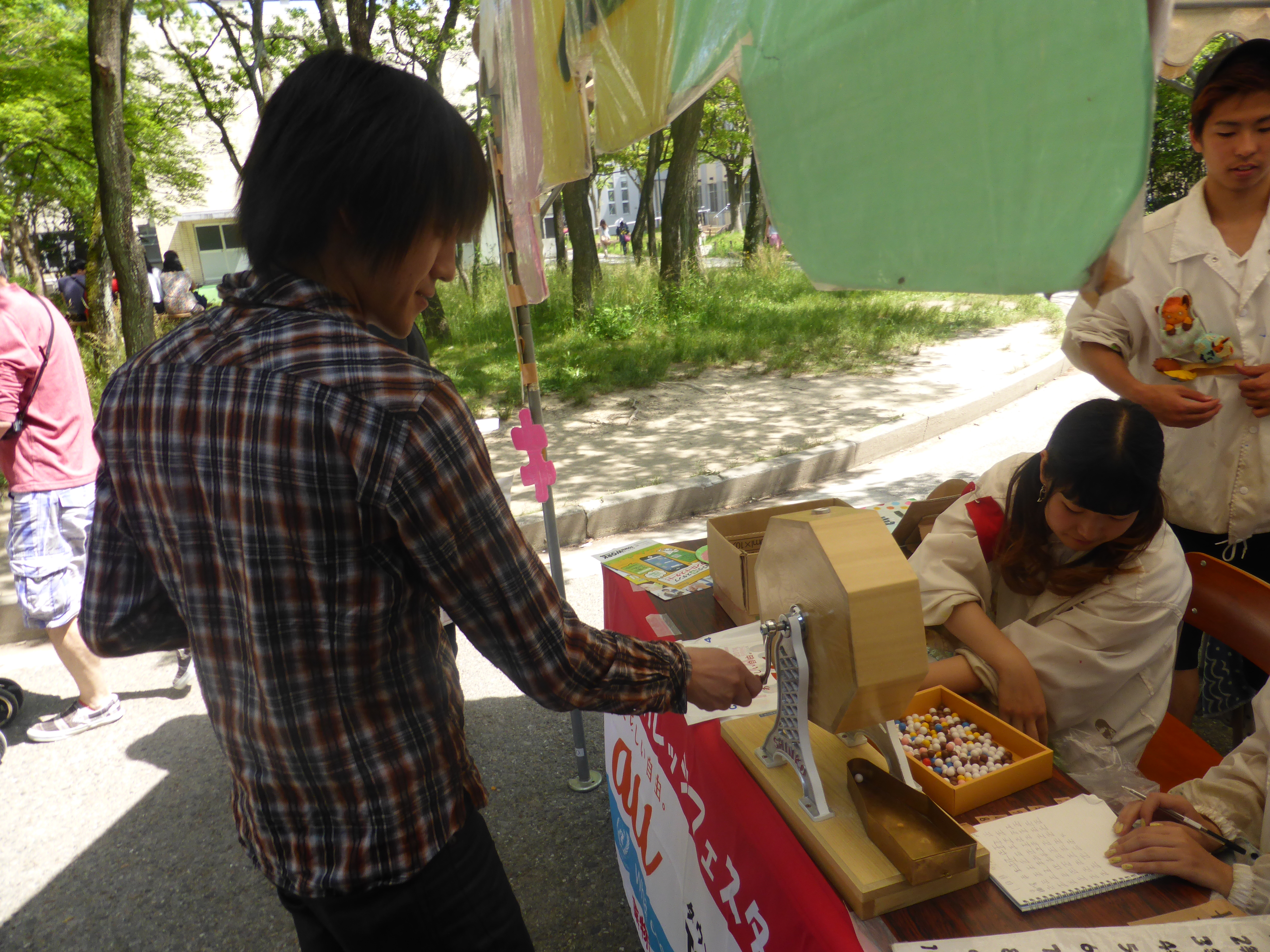 まず初めに、先日瀬田研秘書の緒方さんがケーキを作ってきてくれました! とっても美味しそう(*´﹃`*) 8等分に切り分けてみんなでいただきました! 緒方さん、ありがとうございました! さて、今日は5/24。友好祭です。 林先生と模擬店回りをしてきます! ええ天気やな~ いちょう筋もよく賑わっています! ニコラ発見! 相変わらず良い笑顔! そして首元のピカチュウ可愛ええ━━(*´∀`*)━━!! ポテトとから揚げを待ってるお2人。 初の府大の学祭はいかがでしょうか? ジョンとニコラが所属しているサークルの模擬店の台湾ネギ餅も購入。 その名の通りもっちりとした食感が味わえます。 模擬店でもらえる抽選券を4枚集めると福引に挑戦できます。 早速永井くん、そして厳樫も挑戦! 結果は2人とも9等のカラオケ店の割引券でした。 一方林先生は「1等のクルージングディナーを獲る!」と意気込み十分! 結果は・・・ 8等のワールド牧場の入園券でした! 後日瀬田先生にプレゼントされたとかされなかったとか・・・ 1時間ちょっとでしたが、楽しんでいただけたようで良かったです! 揚げシューアイスもおいしそうに食べていらっしゃいます。 追伸: 翌日の昼は岸本さんと回りました。 校内で流れているラジオのリクエスト番組にリクエストして抽選に当たると、フェスのグッズがもらえるそうです。 ケーキ&友好祭模擬店回り