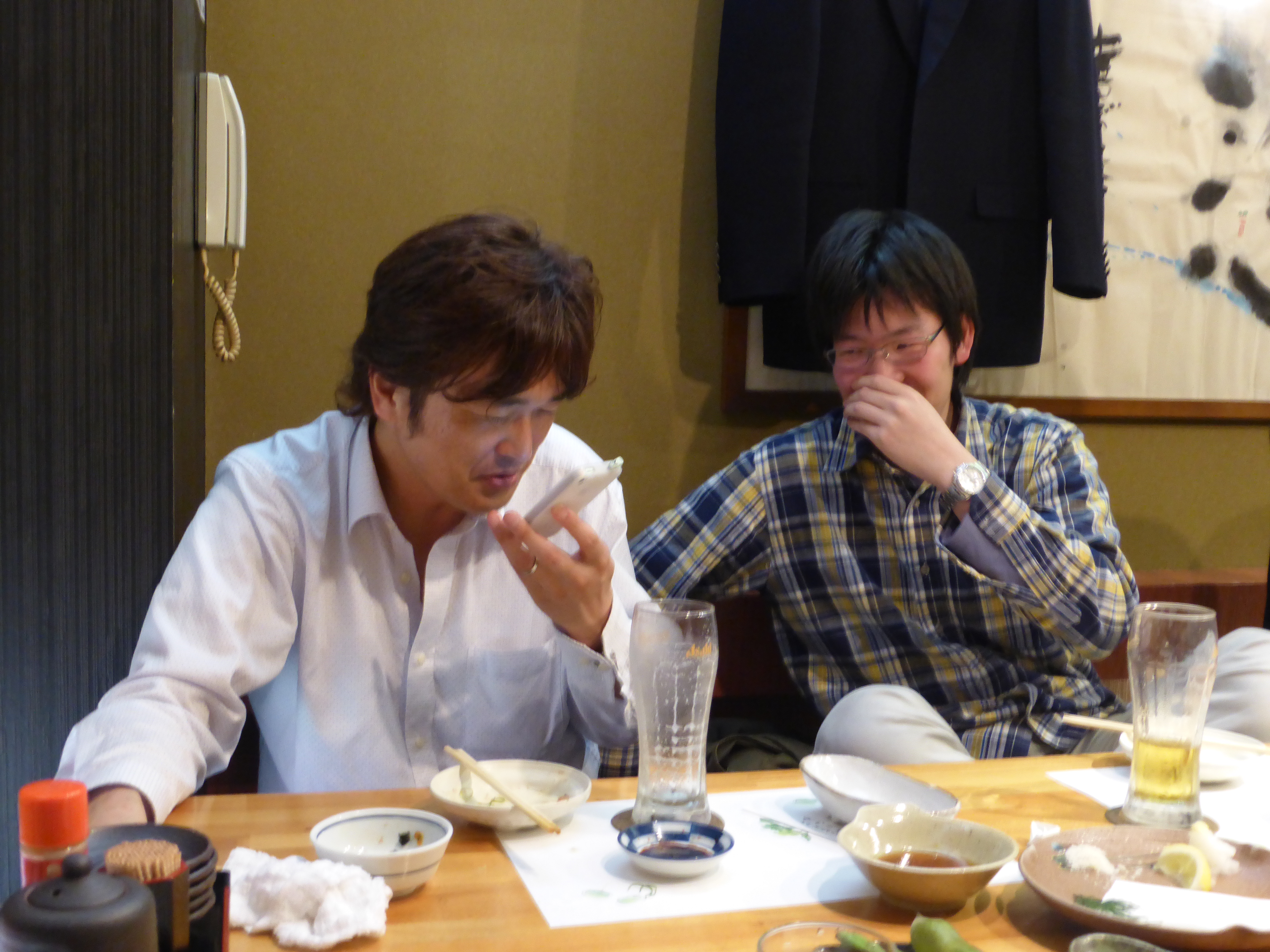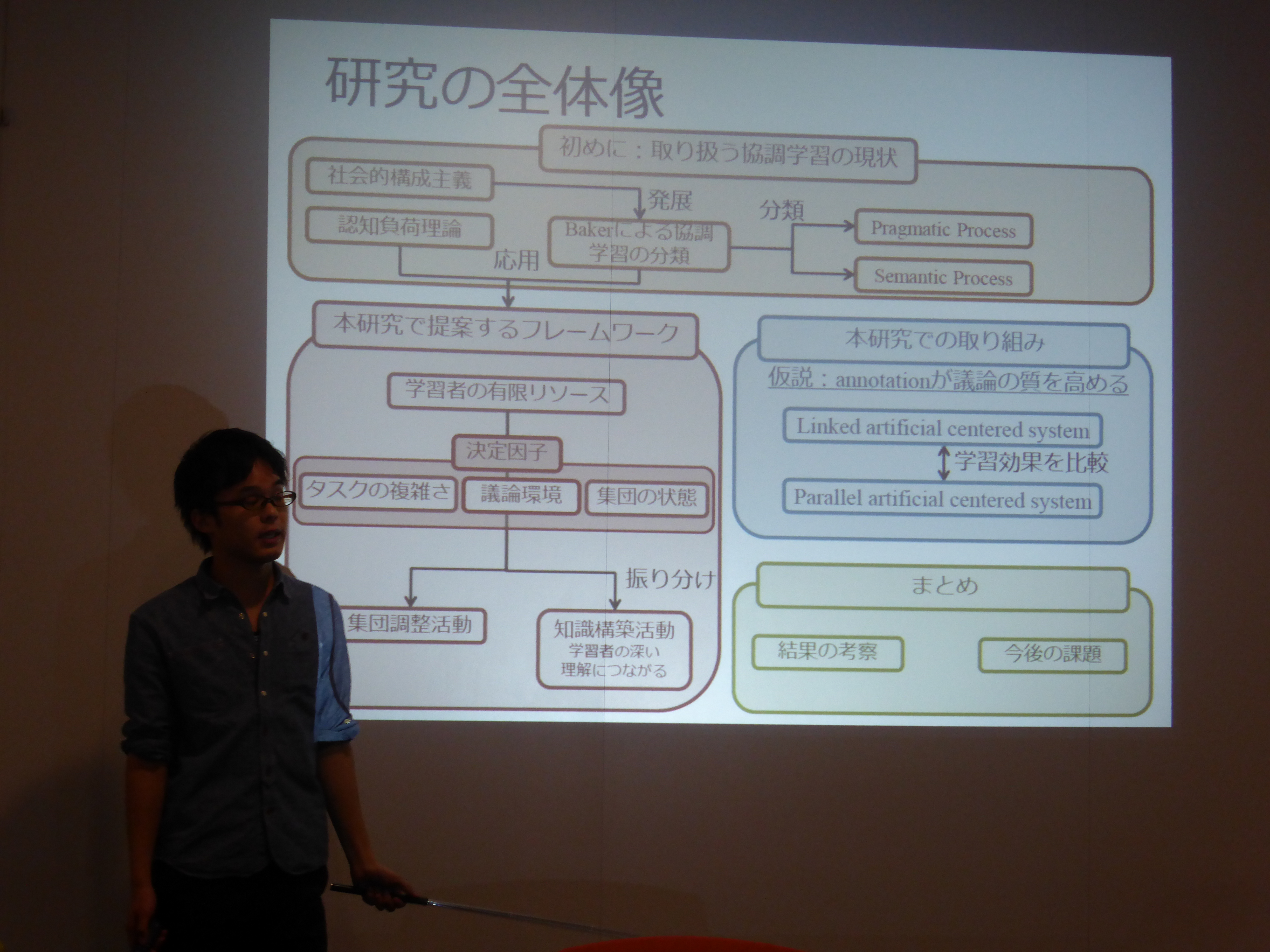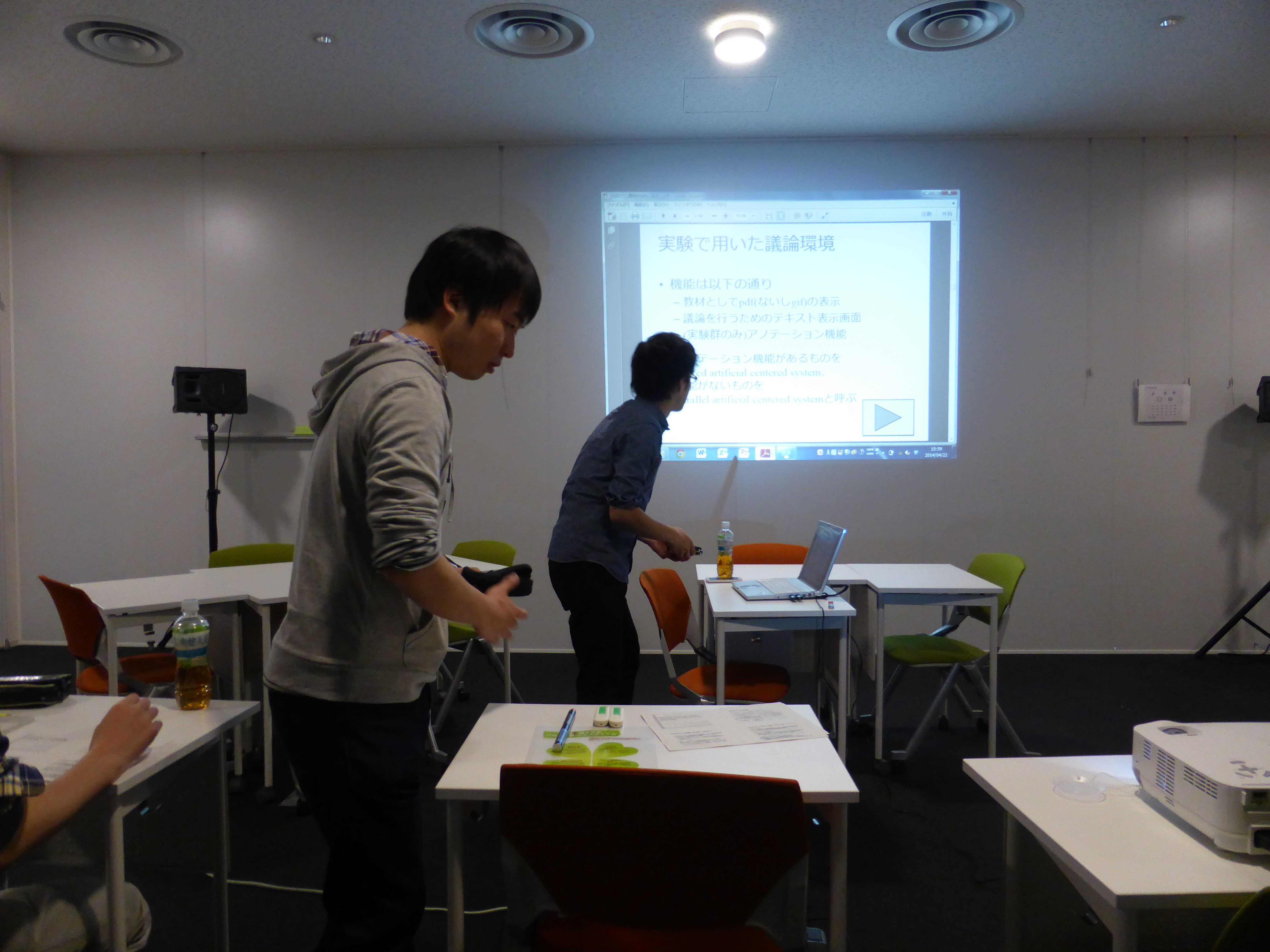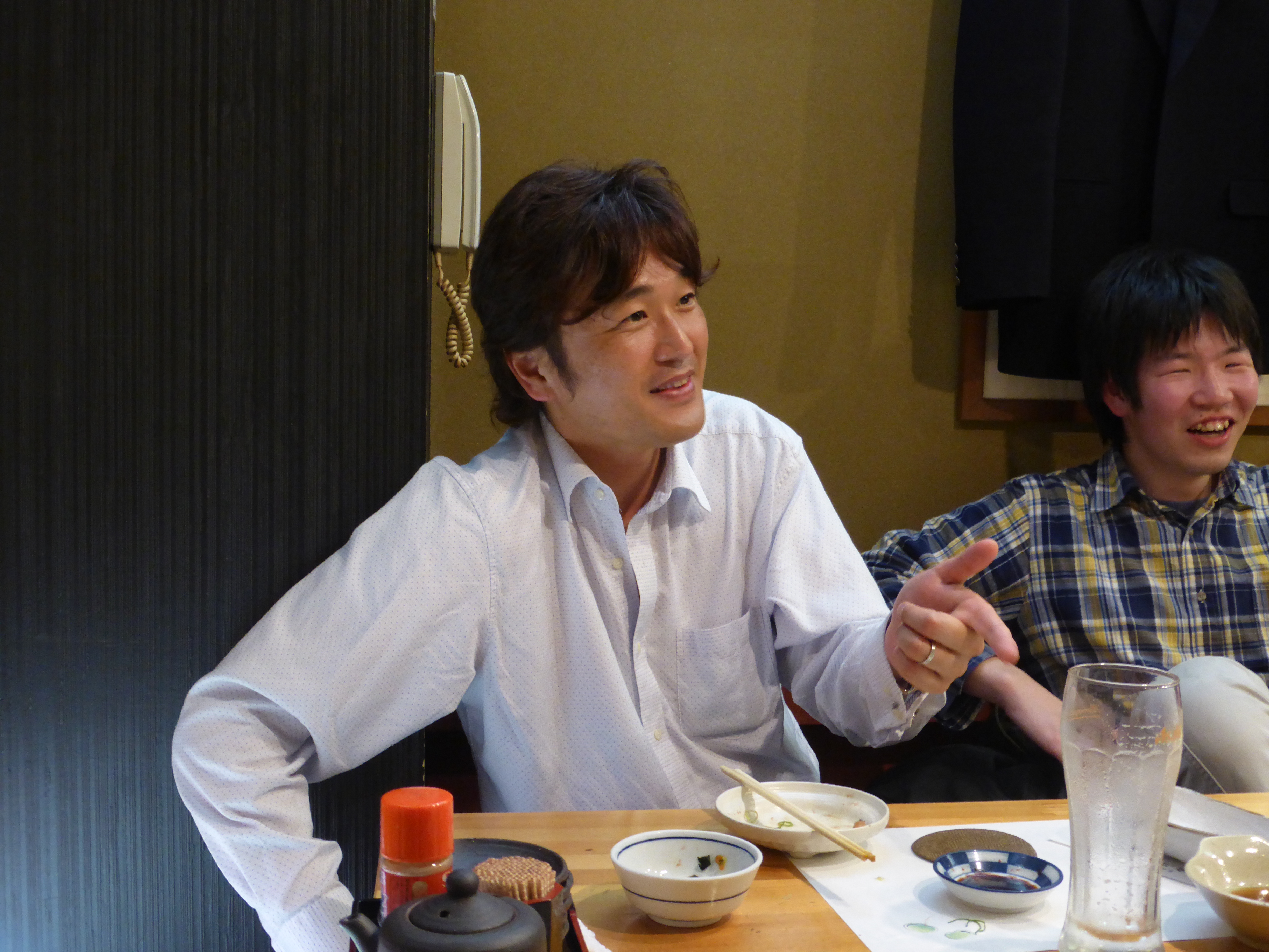今日から関西大学の小尻研究室と合同ゼミ。 記念すべき初回でございます。 みんなで準備中・・・ 今日の発表者は岸本さん。 図を使っていて内容をわかりやすく表現しているスライドです。 先生方や他の学生は、真剣に発表を聞かれています。 また、資料を見比べながら時折議論し合ったりします。 ゼミの後は親睦会です! 普段は見ることのできないメンツの組み合わせです! 林先生と関西大学の名手さんです。 林先生は小尻研と既に交流があり、すっかり打ち解けています。すごく良い笑顔です。 一方、瀬田先生と語り合う厳樫。 スマホの画面に何が写っていたのでしょうか? 今回終始目立っていたのは岸本さんでした。 発表に登場したBBS(Bulletttttttttin Board System)のことについて熱く語っていました。 そのことについて、瀬田先生と岸本さんの議論が非常に白熱しています(笑)。 僕たち4回生も勉強になりました。 今日も楽しかったな。(永井談) 関大合同ゼミ&親睦会