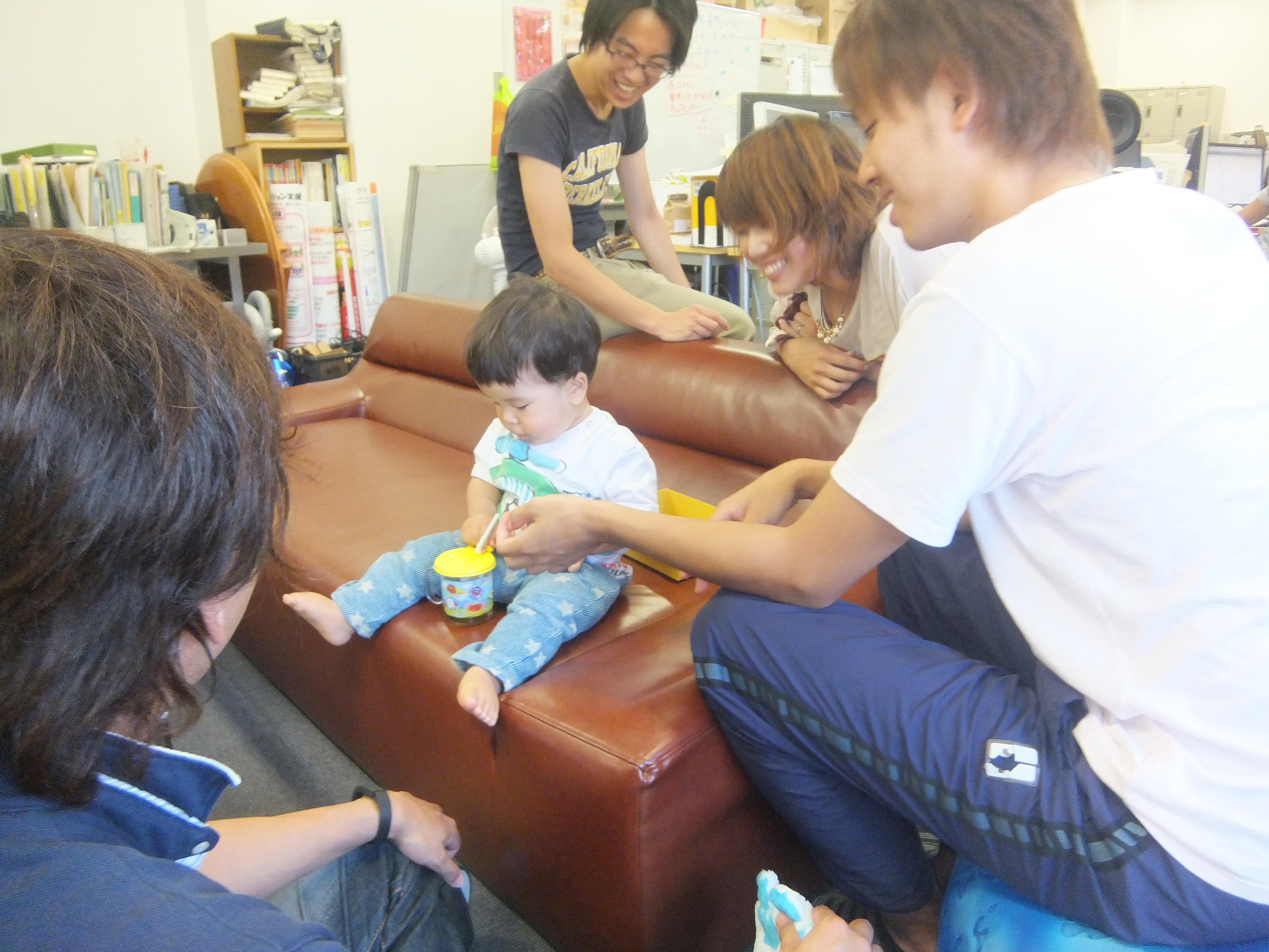 研究室のOB・OGである前野さん原さんがお子さんの智くんを連れて遊びに来てくれました!!! めちゃくちゃかわいいです、みんなの注目の的になって少し恥ずかしそう?? 慣れてきたのか、最初はママに隠れてた智くんが遊んでくれるようになりました。前野さん夫婦の智くんを見守る幸せそうな笑顔がとってもいいですね!!!!! 今にも泣きだしそうな顔ですが、ついにだっこさせてくれました!笑 あっというまに大きくなるのでしょうね。次に遊びに来てくれる時まで、顔を覚えててくれるでしょうか^^ 私たちも智くんの成長をすごく楽しみにしてますので、ぜひまた近いうちに顔を出してもらえたら、と思います!! 前野さん一家来訪