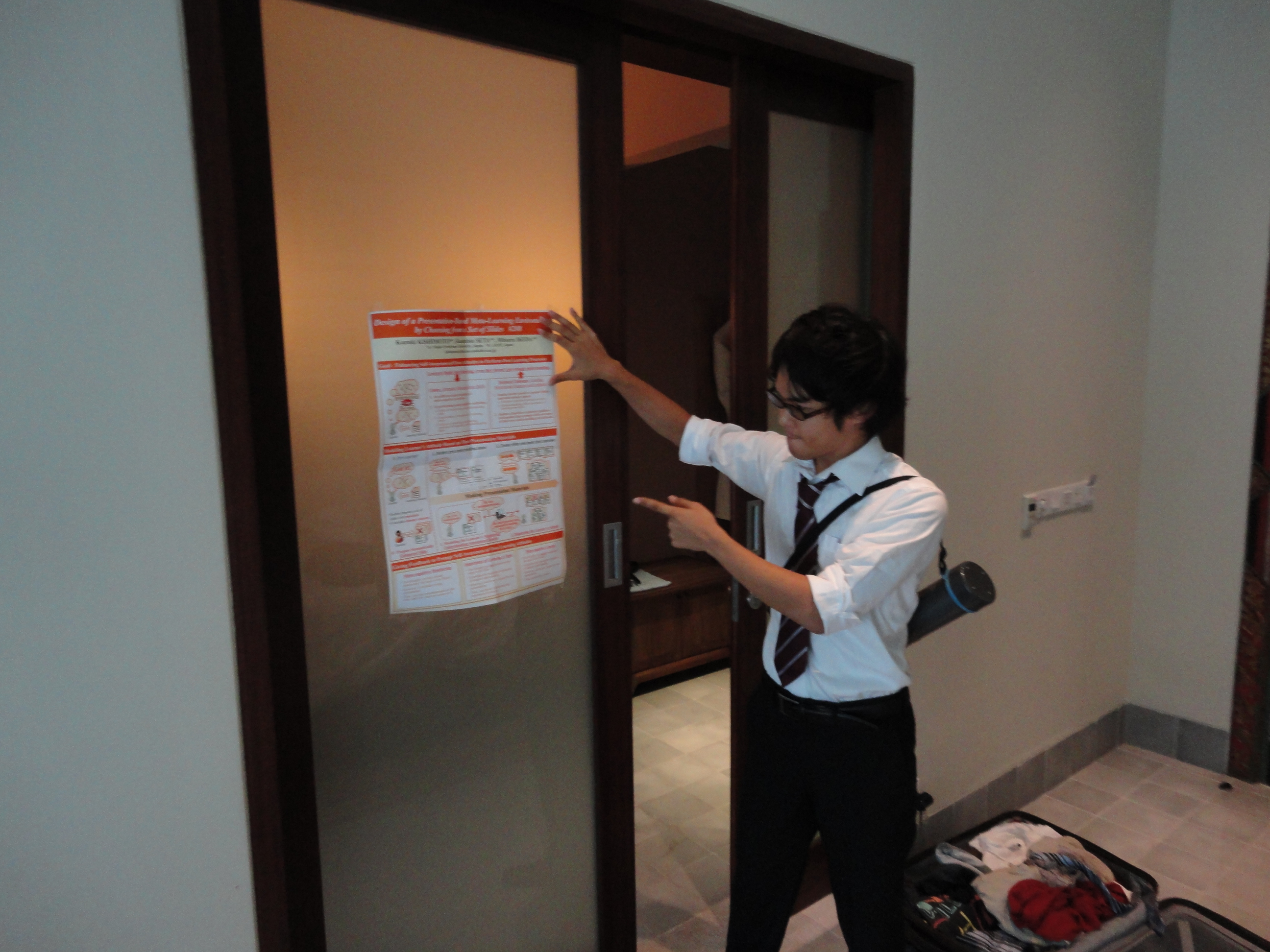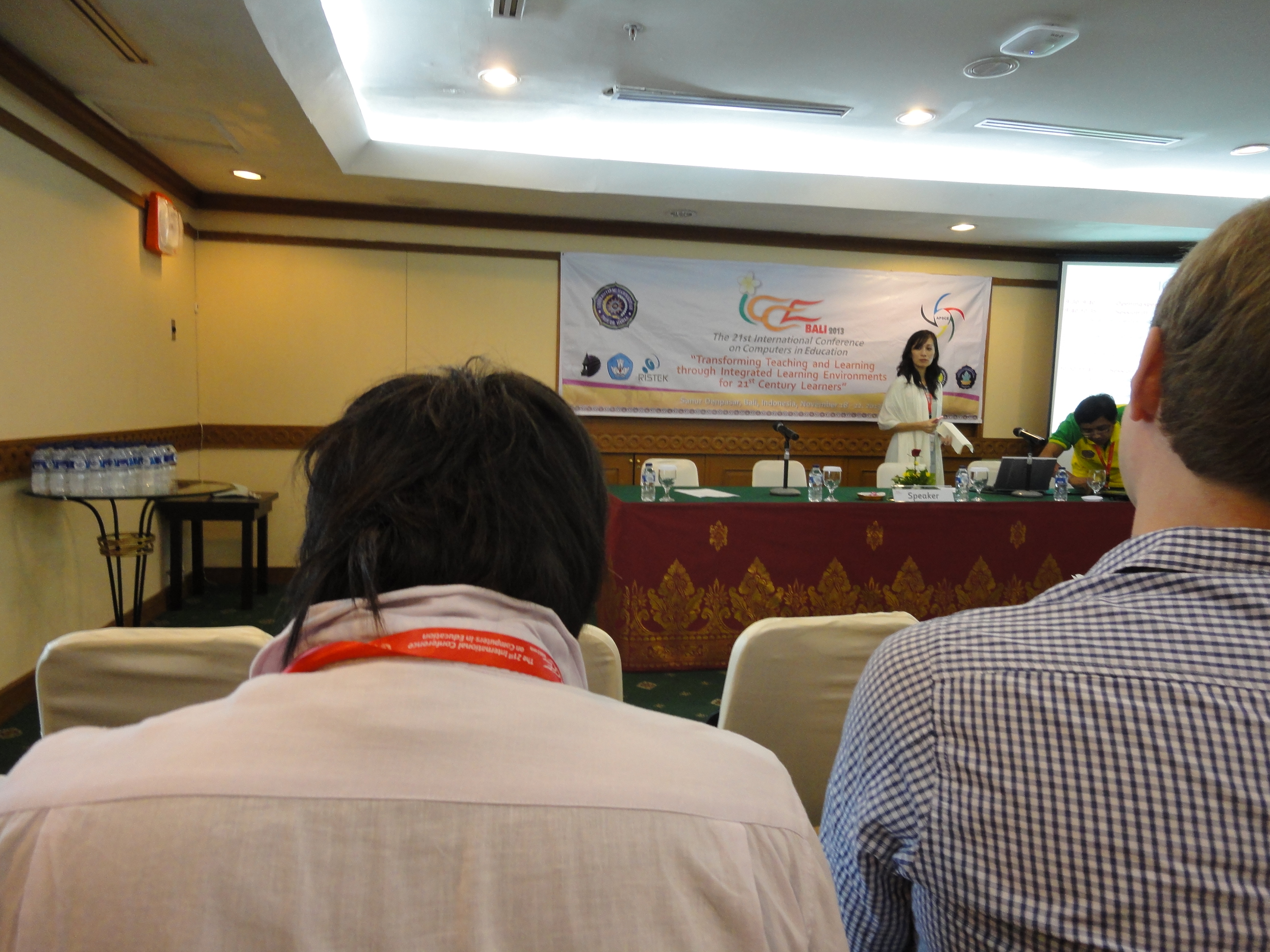 今回は瀬田先生と岸本とジョンがICCEという国際学会に参加してきました!会場はバリ島にあるこちらのホテルです! 中はこんな感じです。とても豪華! 各部屋はこのようになっています。この写真を撮った時は関西大学の小尻先生がワークショップの準備をされていました。 我々が止まっているホテルはコチラです。こちらもとてもきれい! 中はこのような感じ。とても広く、のびのびと過ごせました。 ホテルにはプールもありました!この写真はそこでの一枚です。 岸本の発表日の朝の様子です。ギリギリまで発表練習をしていました…… いよいよポスター発表開始!いろんな人に聞いて貰えたのでよかったです! 少し観光もしてきました。これは銀細工を作成している様子。すごく細かい! お寺にも行きました!観光にはアルバート先生も一緒に行きました。 瀬田研メンバーで一枚。 ライスフィールド(棚田)も見てきました!その時の集合写真です。 棚田を下まで降りることもできました!けっこう疲れた…… ご飯を食べたところでは民族舞踊を見ることができ、その後で一緒に写真を撮ることが出来ました! 学会中色々なレストランに行ったのですが、どこも料理は本当においしかったです! 最終日、いよいよジョンの発表です。発表も問題なくできて、しっかりと質疑も答えることができました! 最後に広島大学のドクターの先輩方と一緒に記念写真。 とってもいい経験になりました!来年も参加できるように頑張ります! ICCE2013