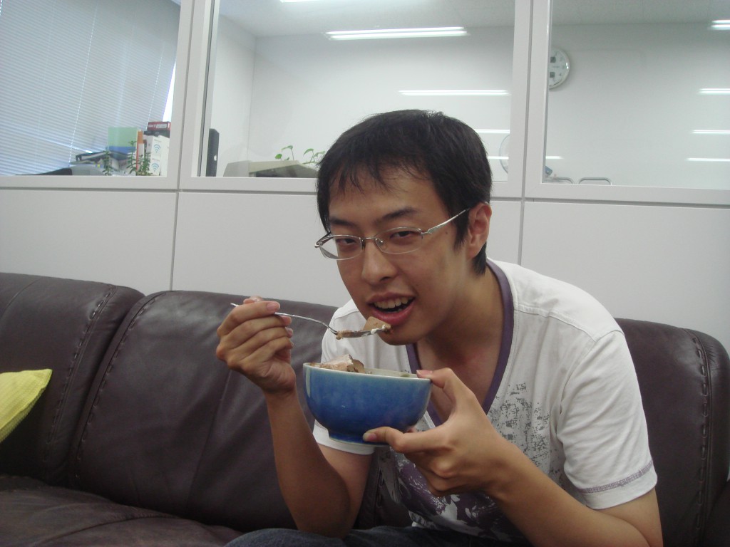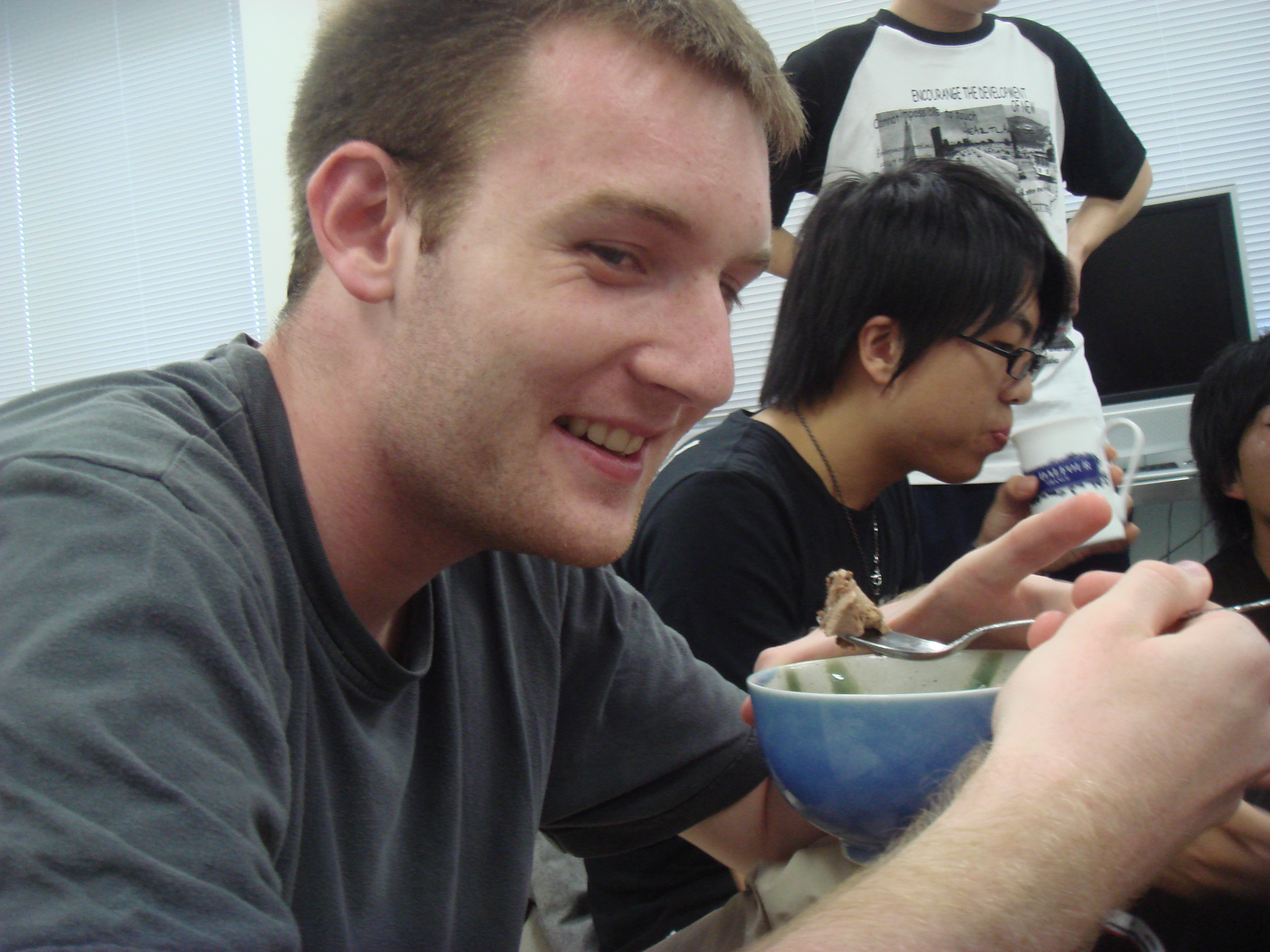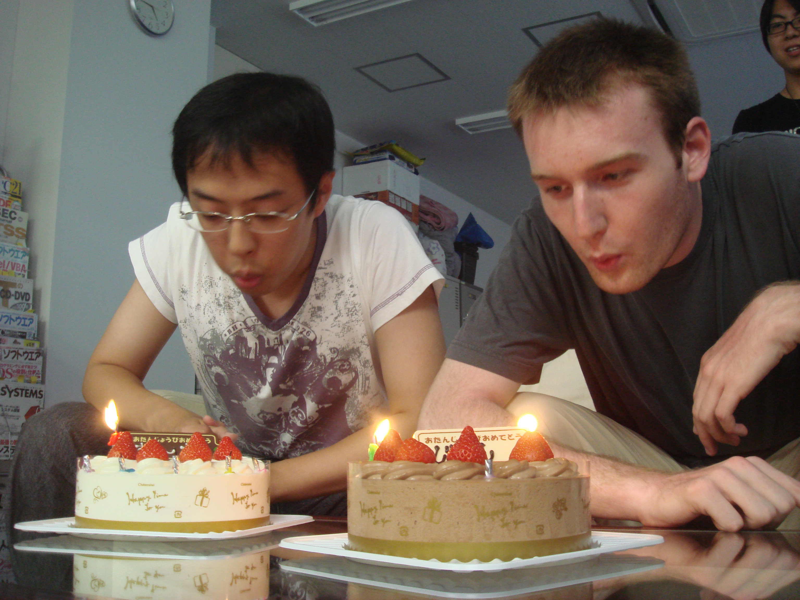 7/15日がむ~さんの誕生日で 7/17日がジョンの誕生日でした♪ む~さんのロウソク多くない?(笑) 二人にろうそくを同時に消してもらいます♪ せーのっ! いただきまーす☆ おいしいですかー? むーさんもおいしいですか? 誕生日の人にはチョコレートのプレート付きです♪ 皆で少しずつケーキはいただきました♪ 留学生ダブルBirthday♪