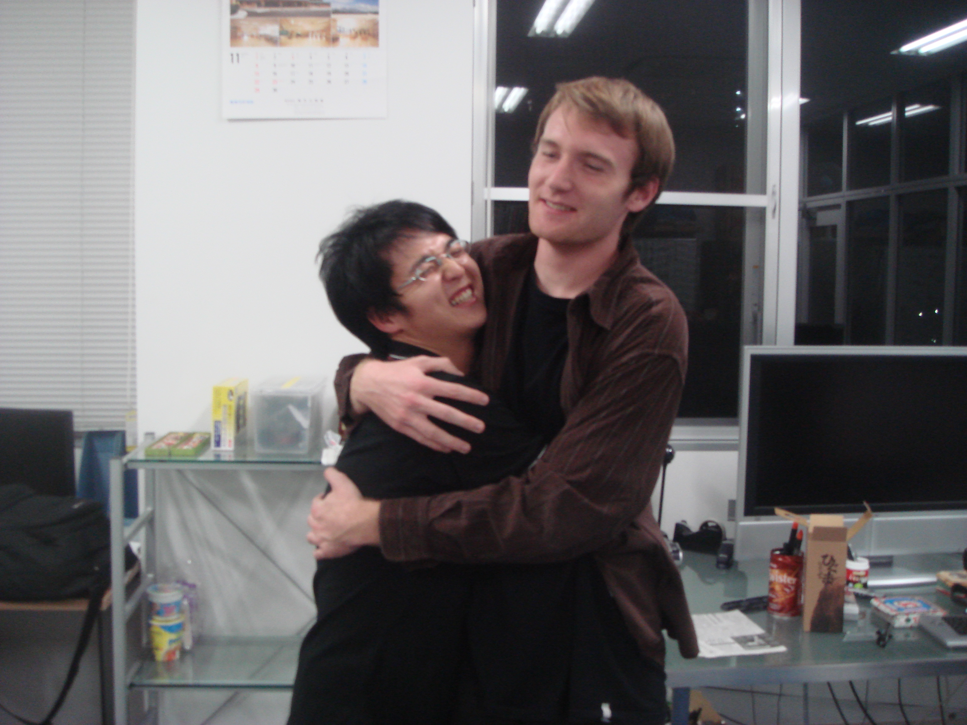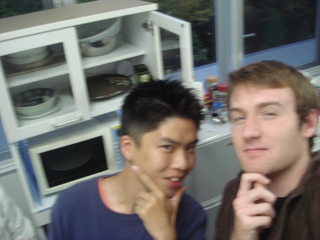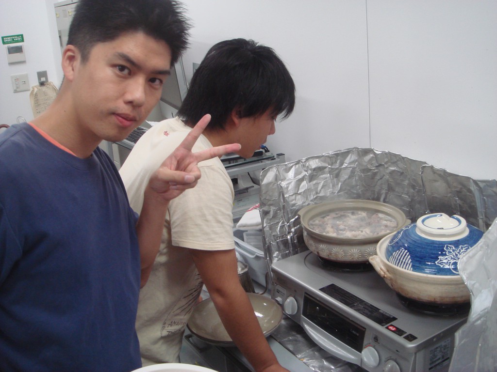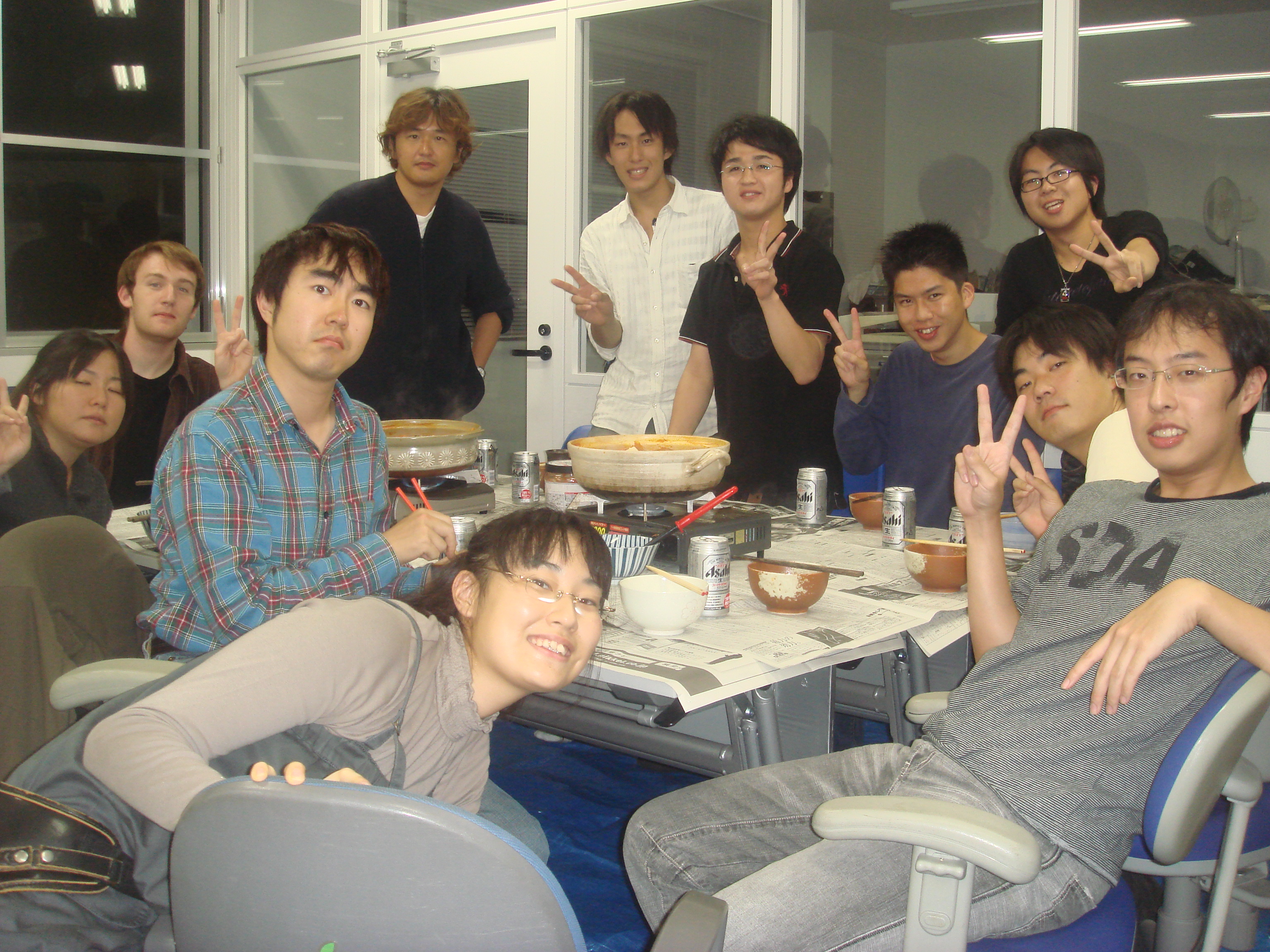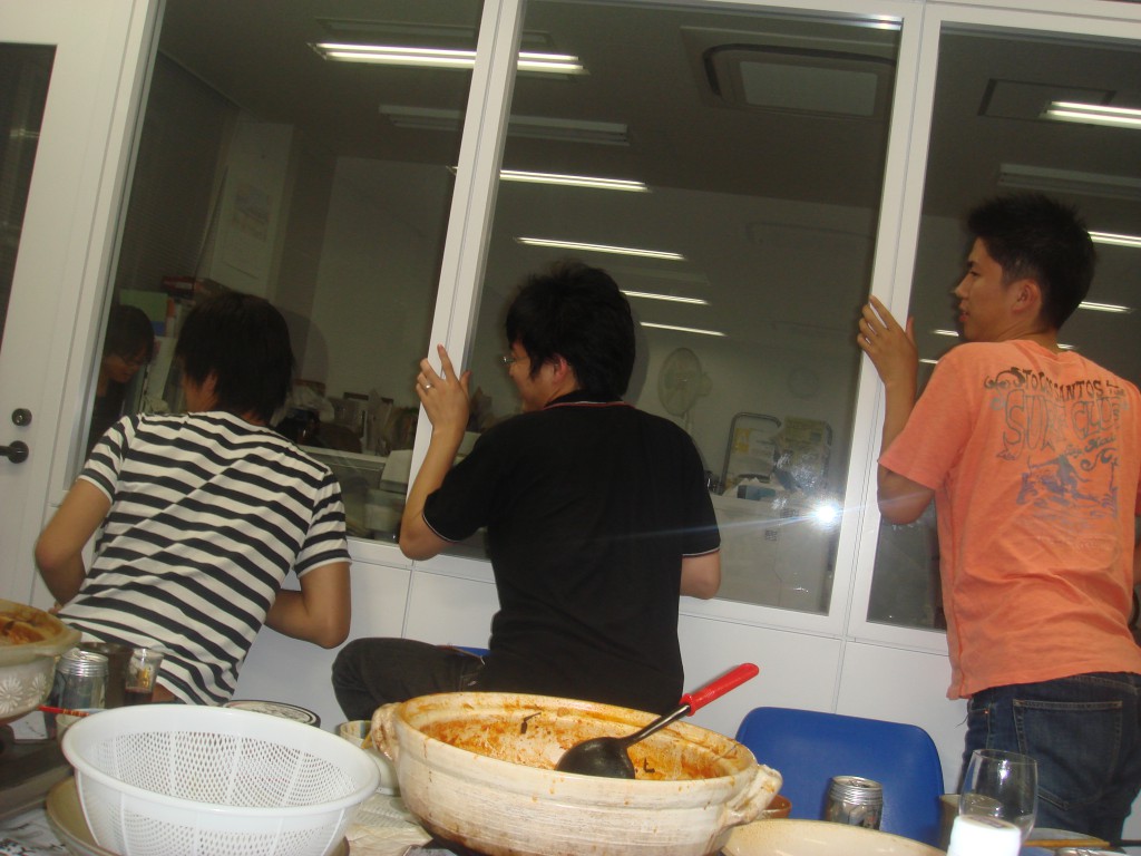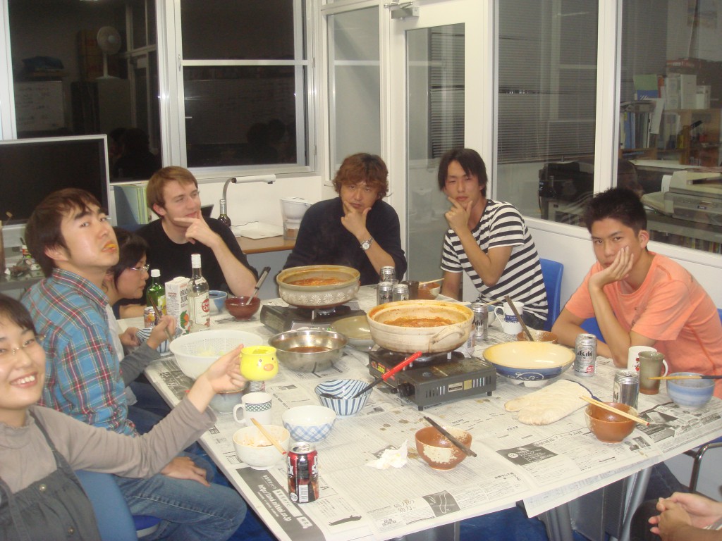 今日のメニューは先生特製てっちゃん鍋です シェフ二人による下ごしらえ中です!! Johnと藤原のツーショット。 ジョンの勝ち!! というか、ジョンずるい笑 乾杯の後にみんなでパシャリ☆ てっちゃん鍋うまそー!早く食べたい!! Johnと一緒に皆でキメ顔。 先生かっこよすぎです! みんなからのプレゼントです♪ たこやきプレートをあげました! フランスでもたこ焼き作ってねー もうひとつ、みんなからの寄せ書きです。 たまにこの寄せ書きを見て 研究室のこと思い出してね☆ ぉ、三人が聞き耳を立ててる。 ガラスの向こうでいったい何が・・・ 青木さん「ジョーーン」 John「ゆうきーー」 ジョンが来てくれたおかげで 良い経験と思い出がたくさん出来ました。 4か月長そうで短い間だったけど、 ほんとうにおつかれさま!! また日本に来たら研究室に寄ってね☆ Johnのお別れ会