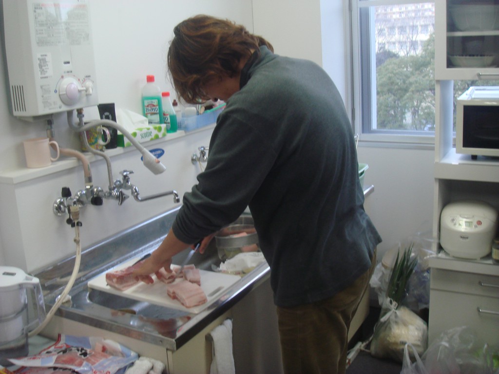 先生が何やら台所で仕込みをしています。