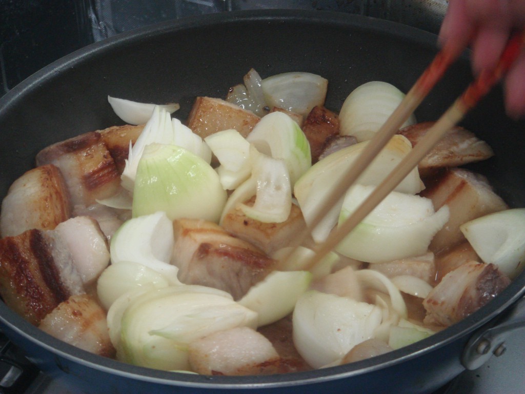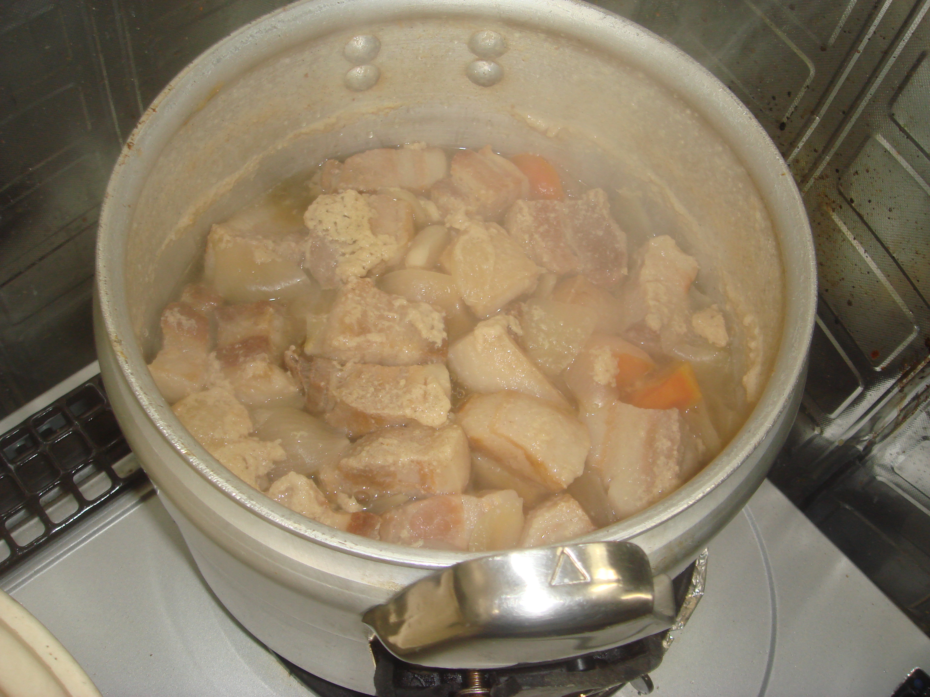 あとでカレーを入れるために豚のバラ肉を角切りにして、野菜と煮込んでいたようです。
